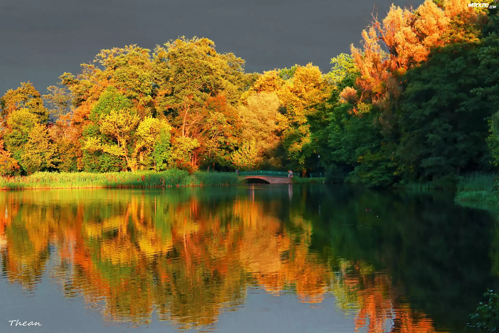Jezioro, Drzewa, Mostek, Odbicie