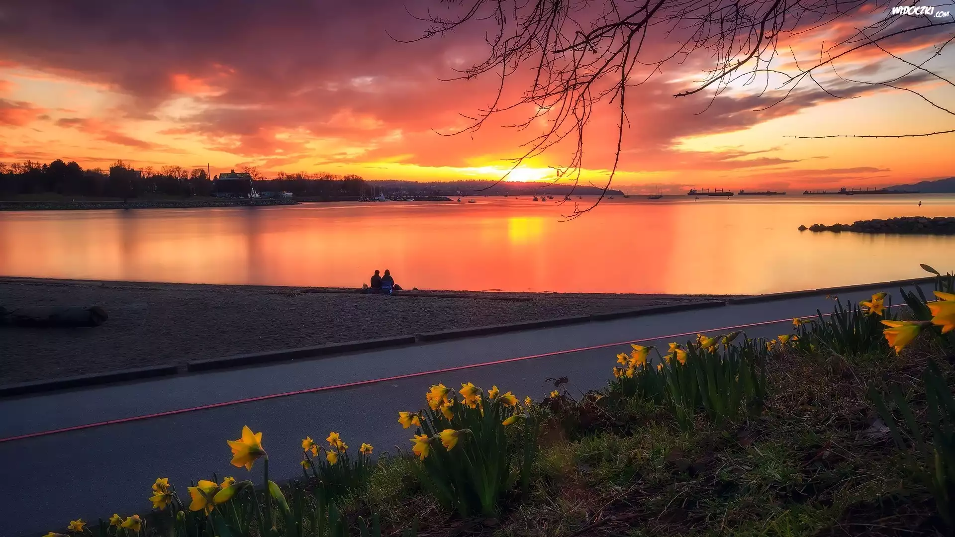 Zdjęcia, Jezioro, Zachód słońca, Droga, Narcyzy żonkile