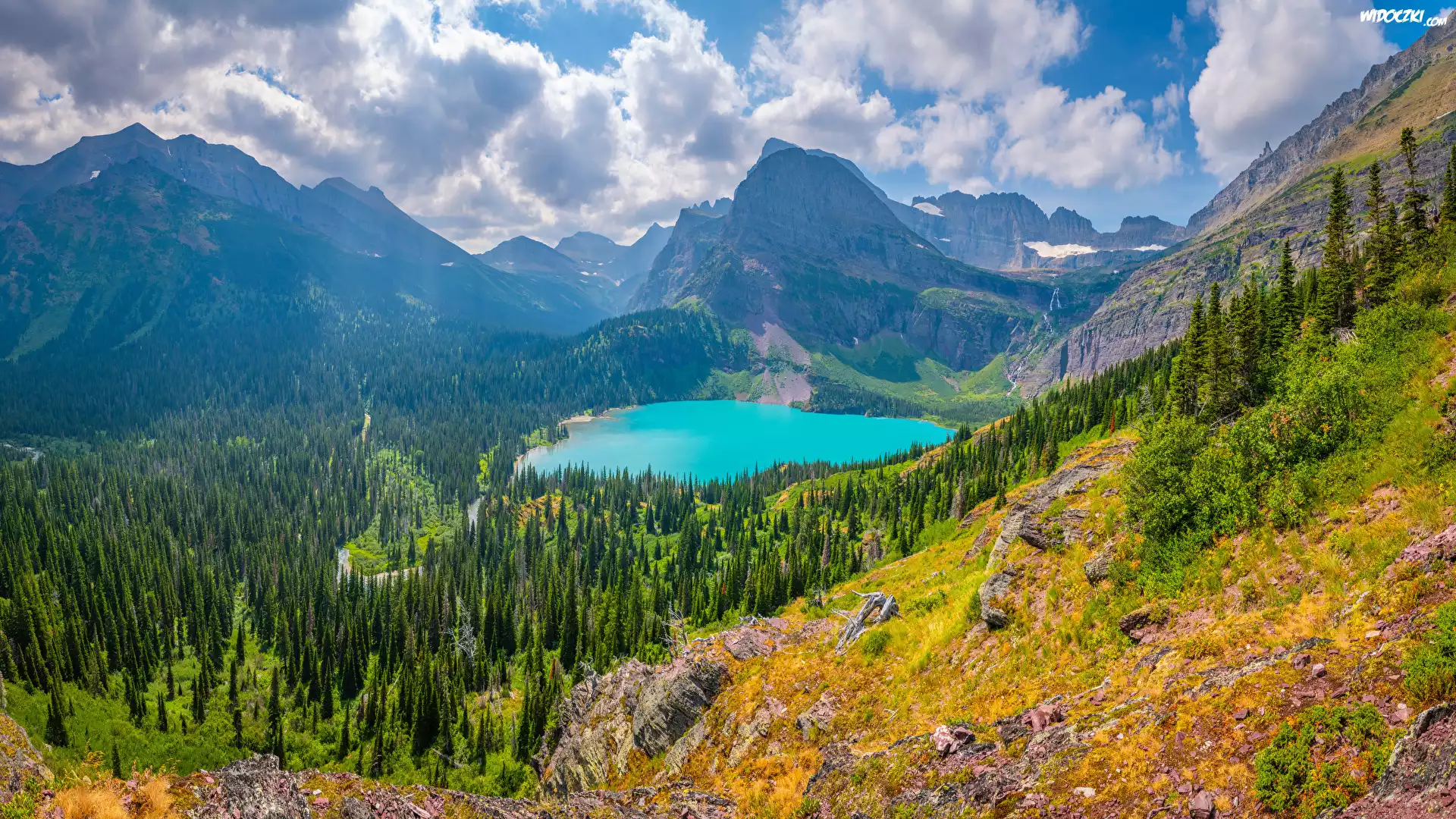 Stany Zjednoczone, Montana, Park Narodowy Glacier, Góry Skaliste, Jezioro St Mary, Las, Drzewa, Chmury |