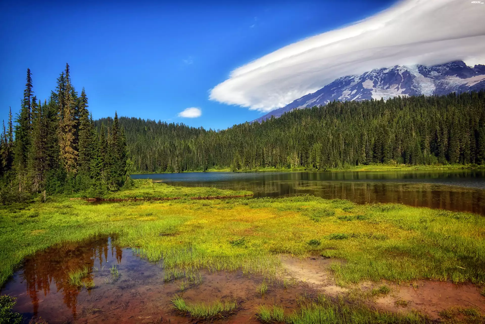 Jezioro, Góry, Las, Park Narodowy, Chmury