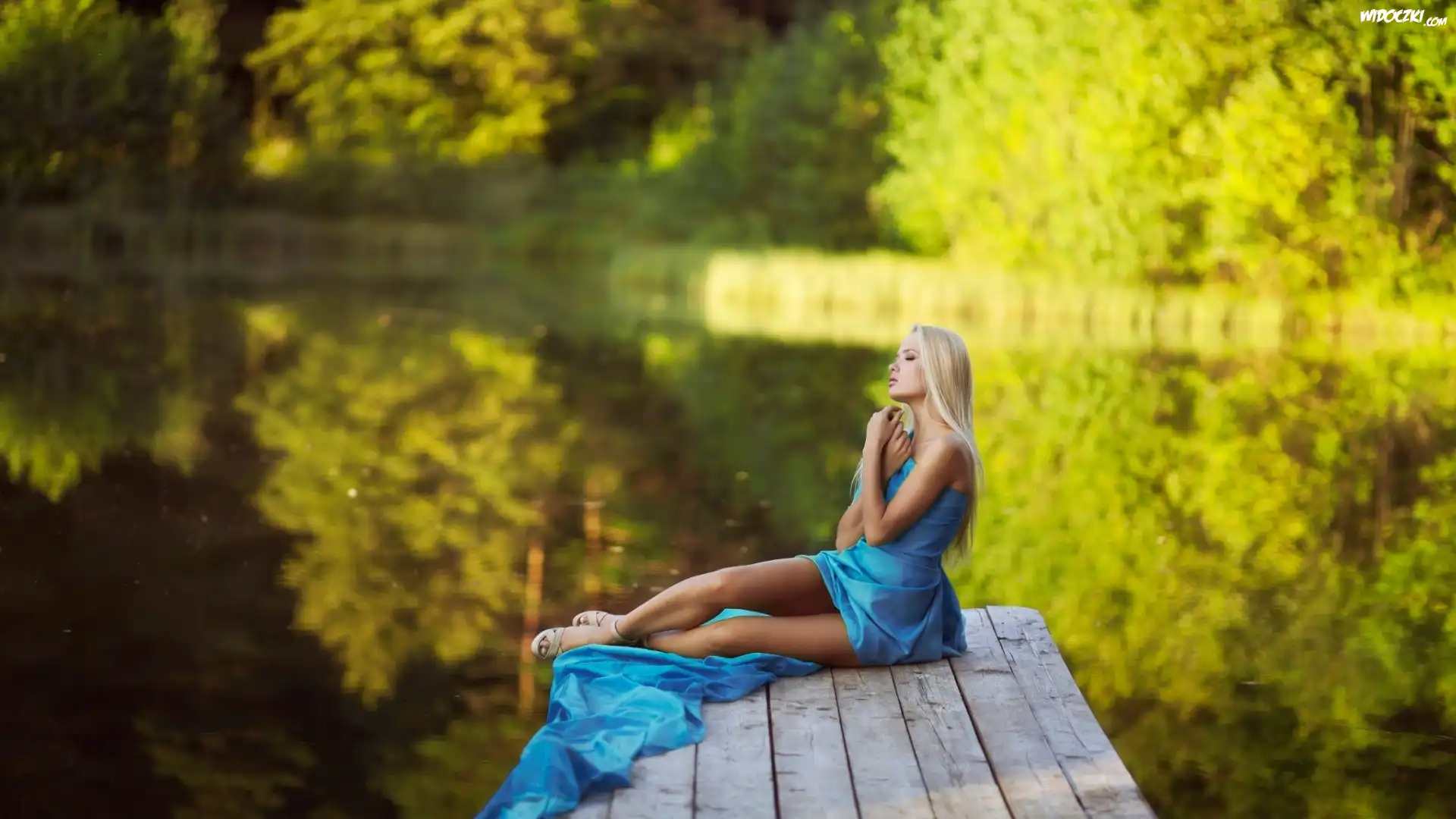 Jezioro, Pomost, Kobieta, Niebieska, Sukienka