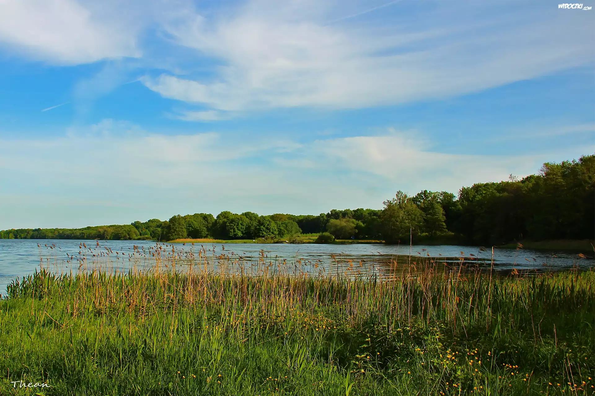 Zdjęcia, Jezioro, Łąka, Niebo, Drzewa