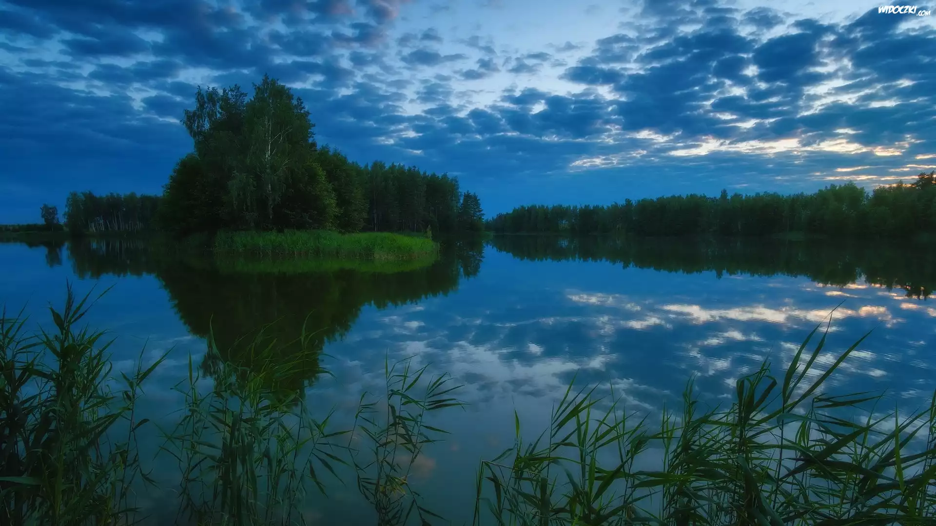 Zdj臋cia, Jezioro, Drzewa, Las, Trzciny, Niebo, Odbicie
