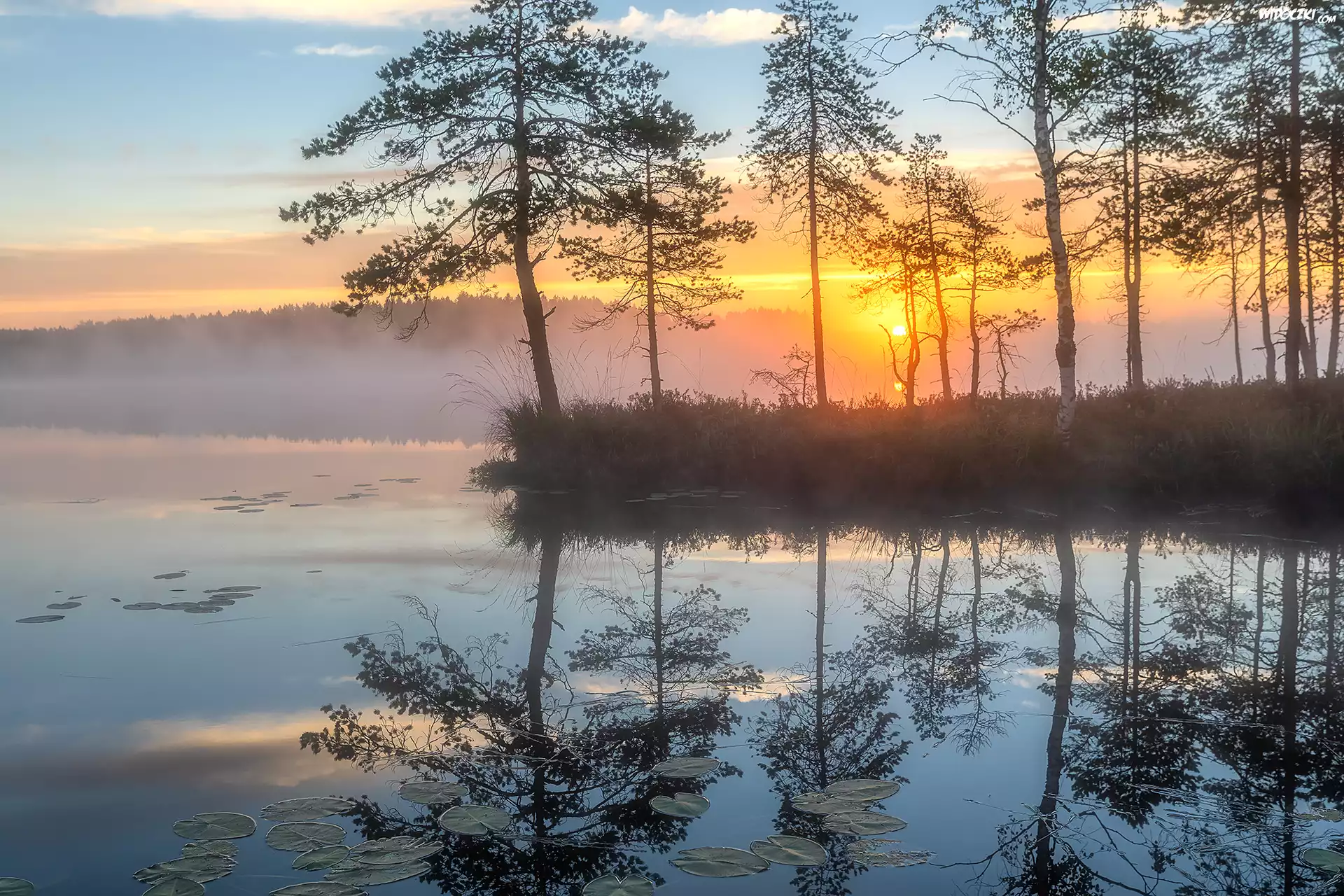 Jezioro, Drzewa, Trawy, Mgła, Las, Poranek, Niebo, Wschód słońca