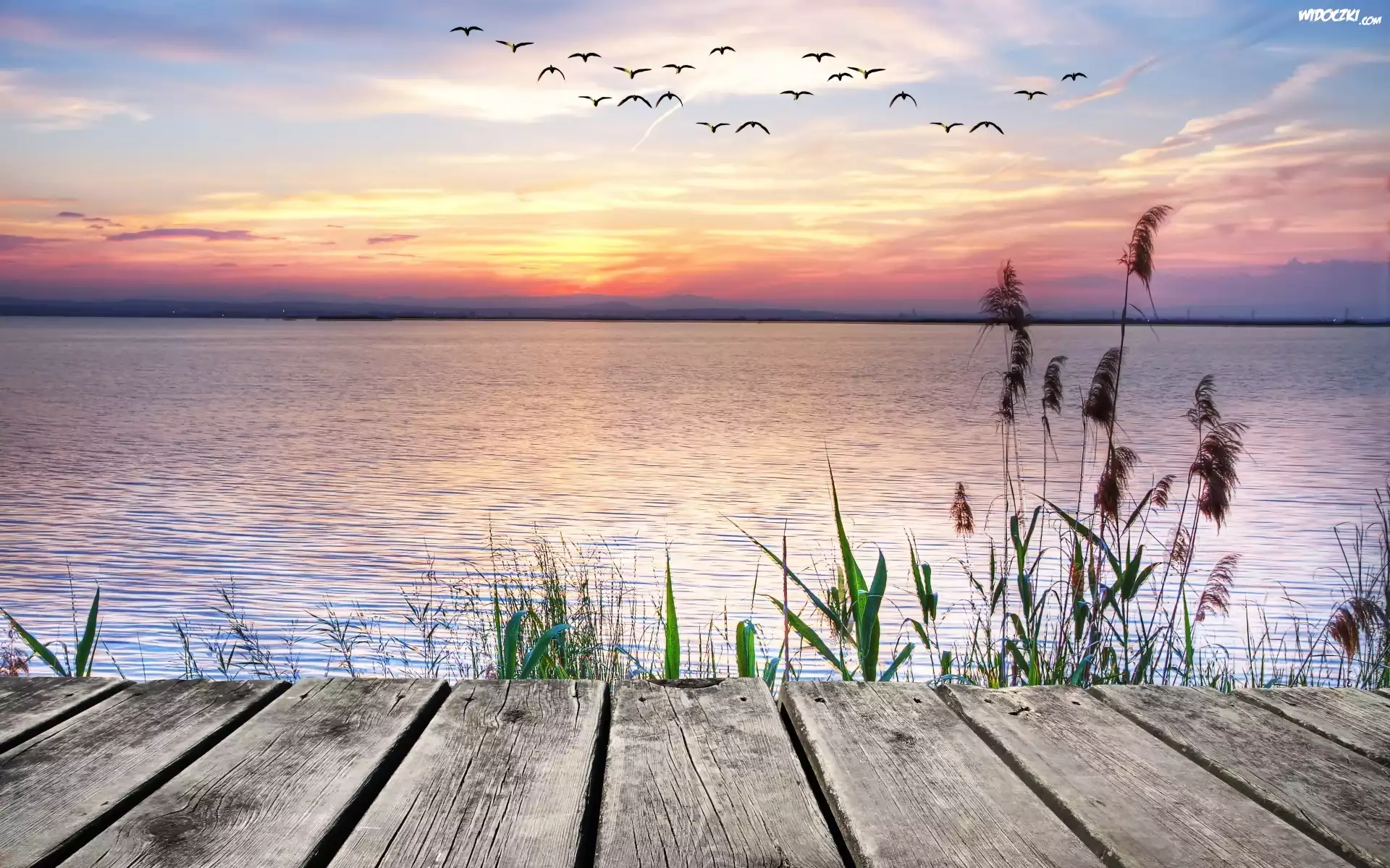Zdjęcia, Jezioro, Pomost, Rośliny, Niebo, Ptaki