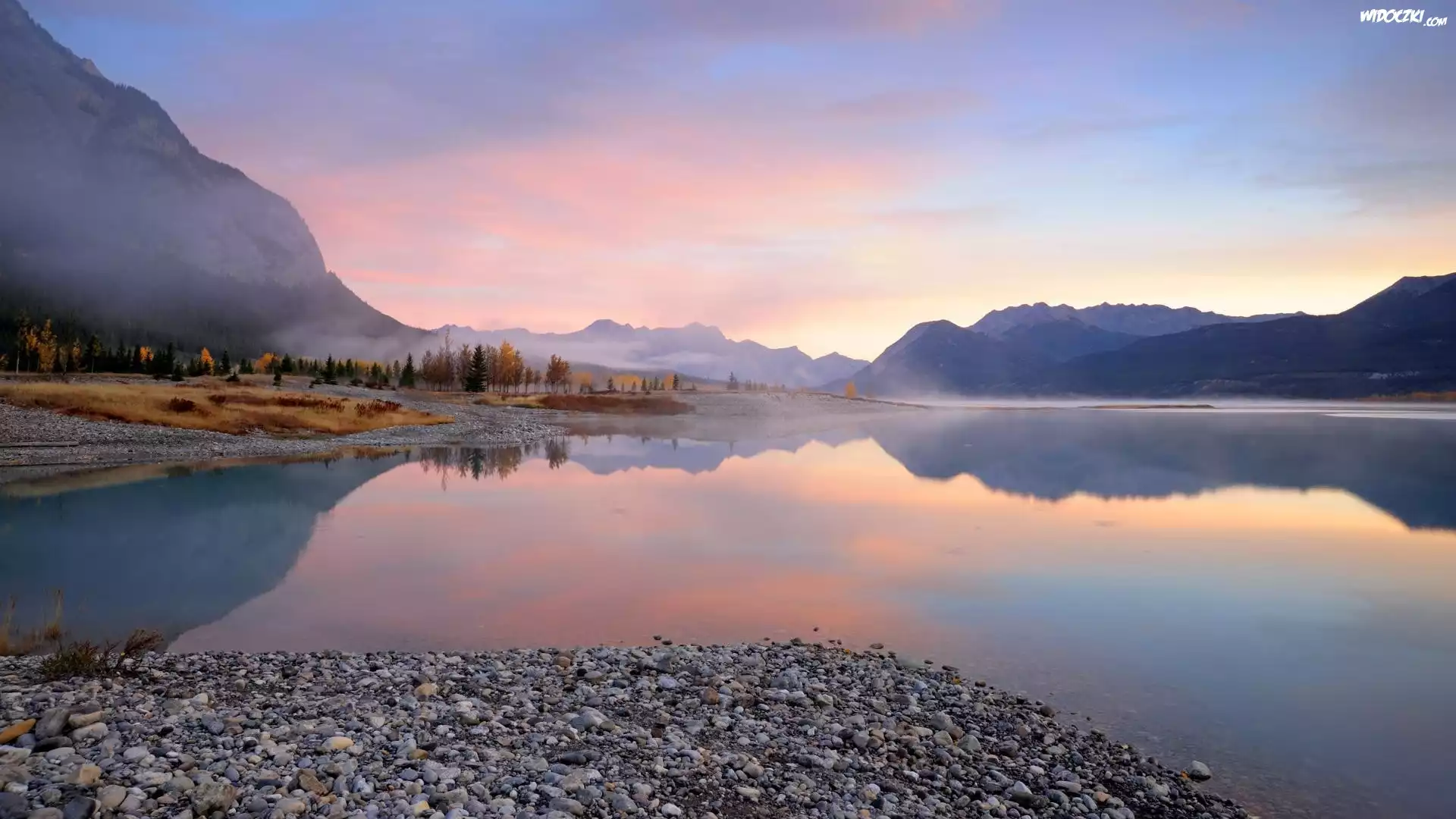 Zdjęcia, Jezioro, Mgła, Różowe, Niebo, Kamienie