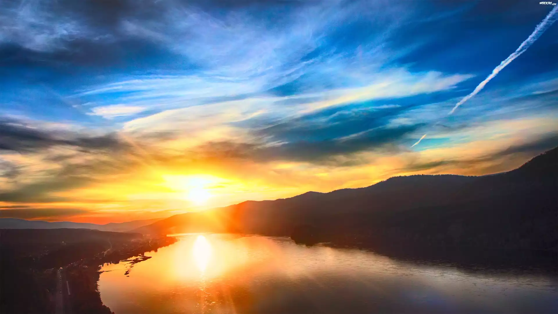 Zdjęcia, Jezioro, Zachód słońca, Niebo, Góry