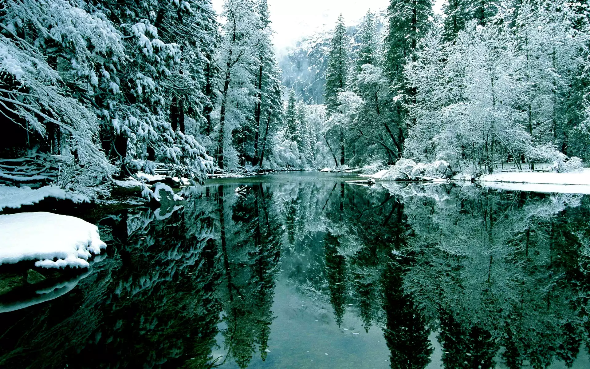 Zdjęcia, Jezioro, Drzewa, Śnieg, Odbicie