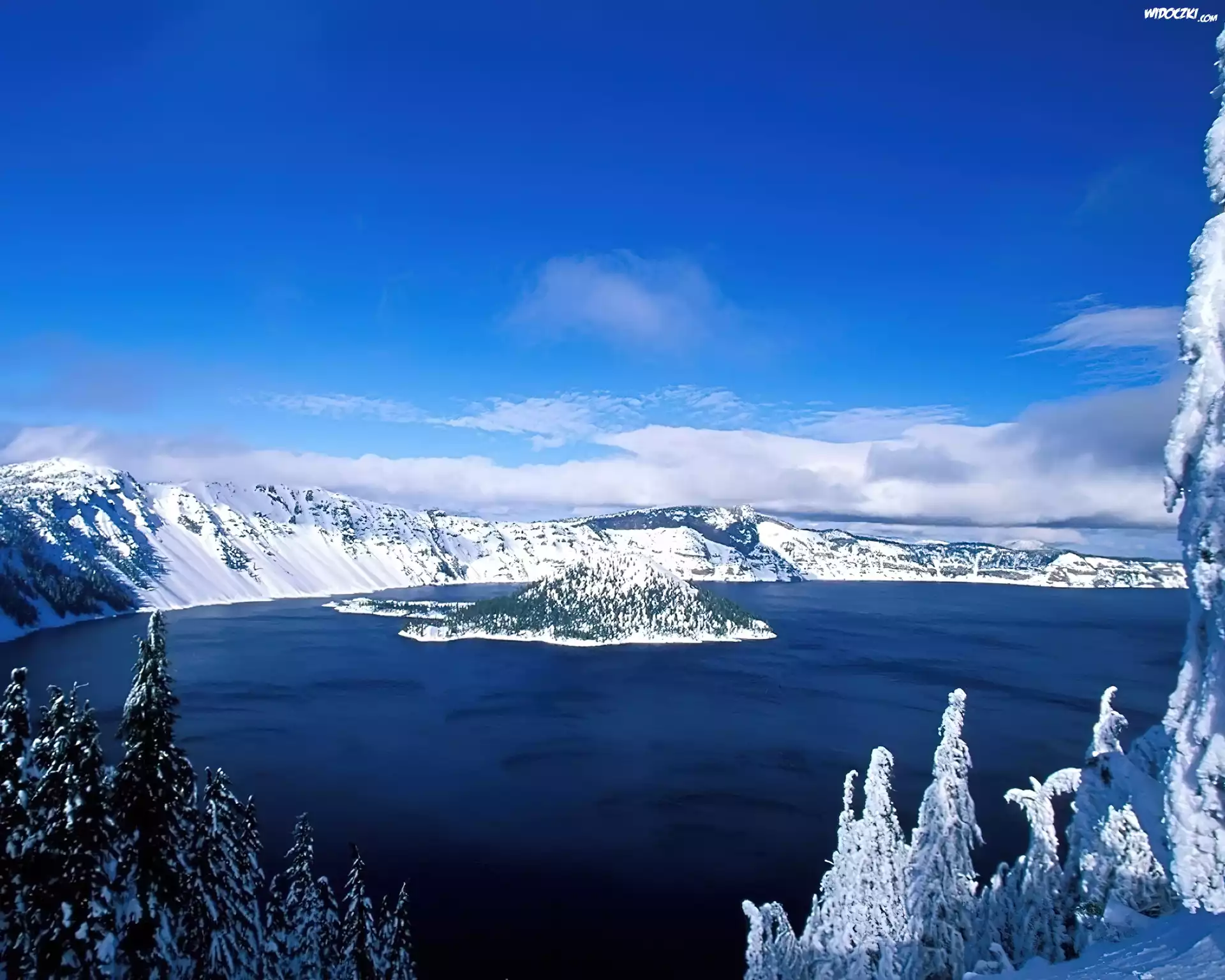 Zdjęcia, Jezioro, Las, Góry, Śnieg, Wyspa