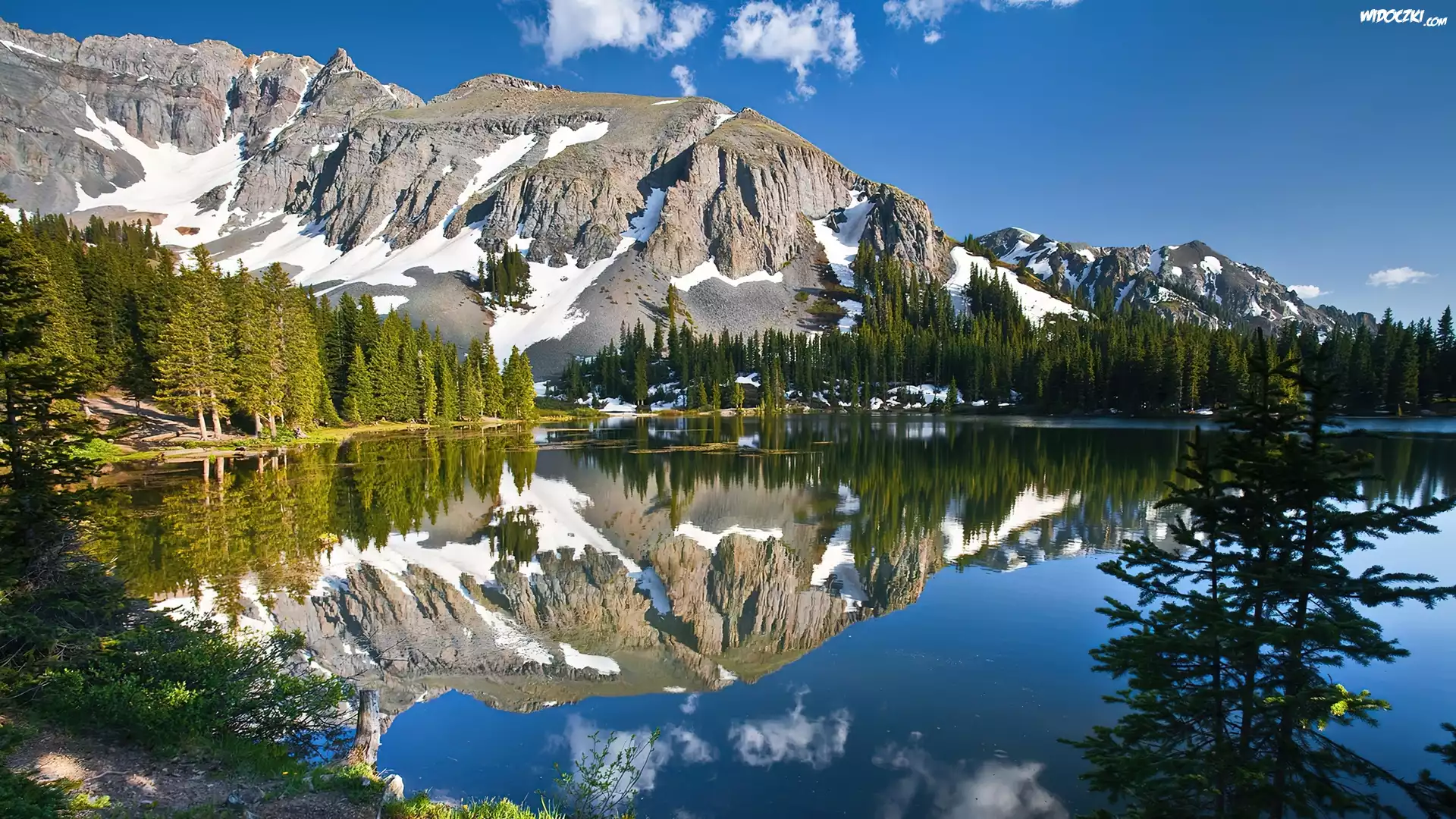 Jezioro, Góry, Śnieg, Świerki