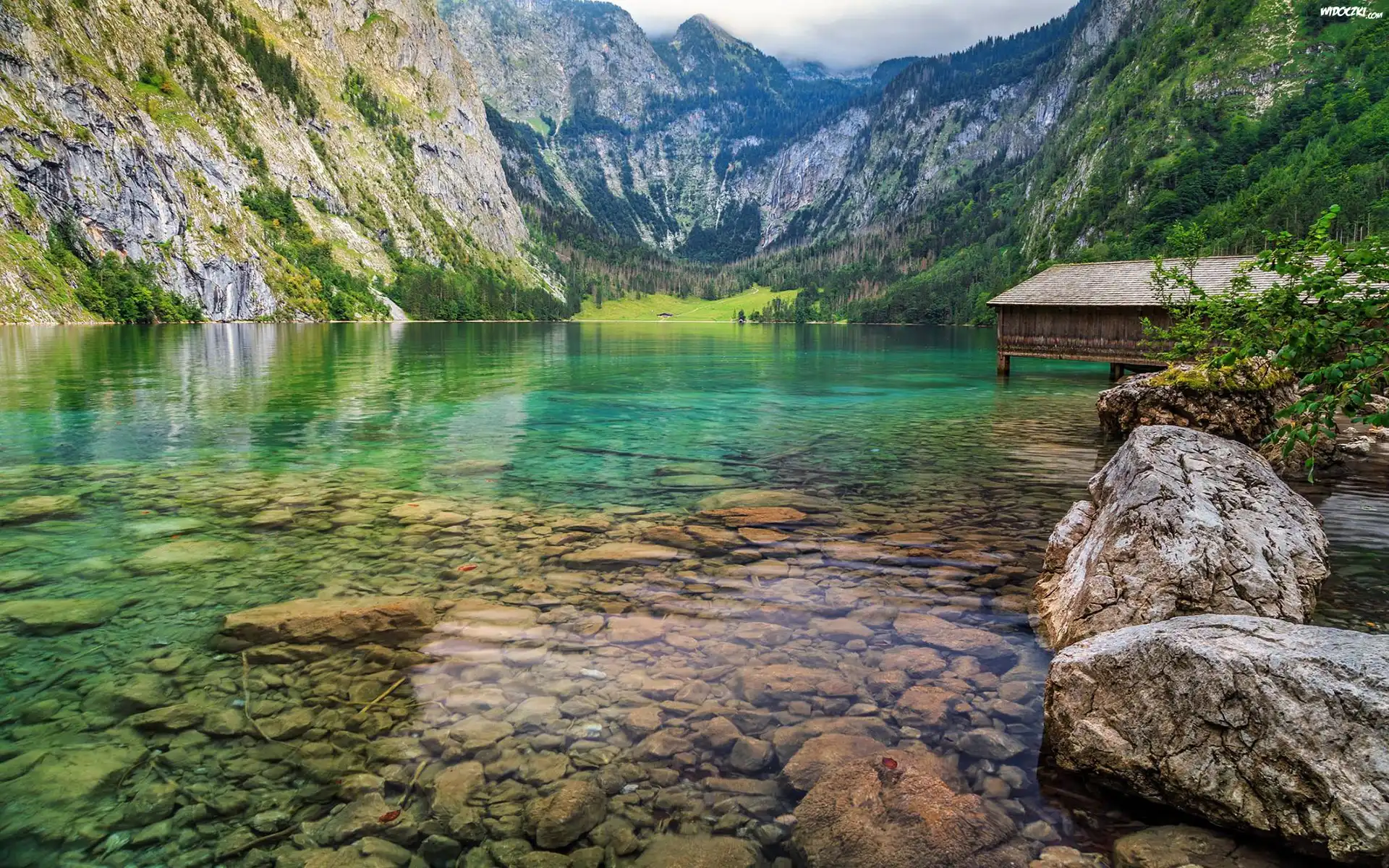 Niemcy, Bawaria, Park Narodowy Berchtesgaden, Jezioro Obersee, Kamienie, Góry, Alpy, Drewniany, Domek |