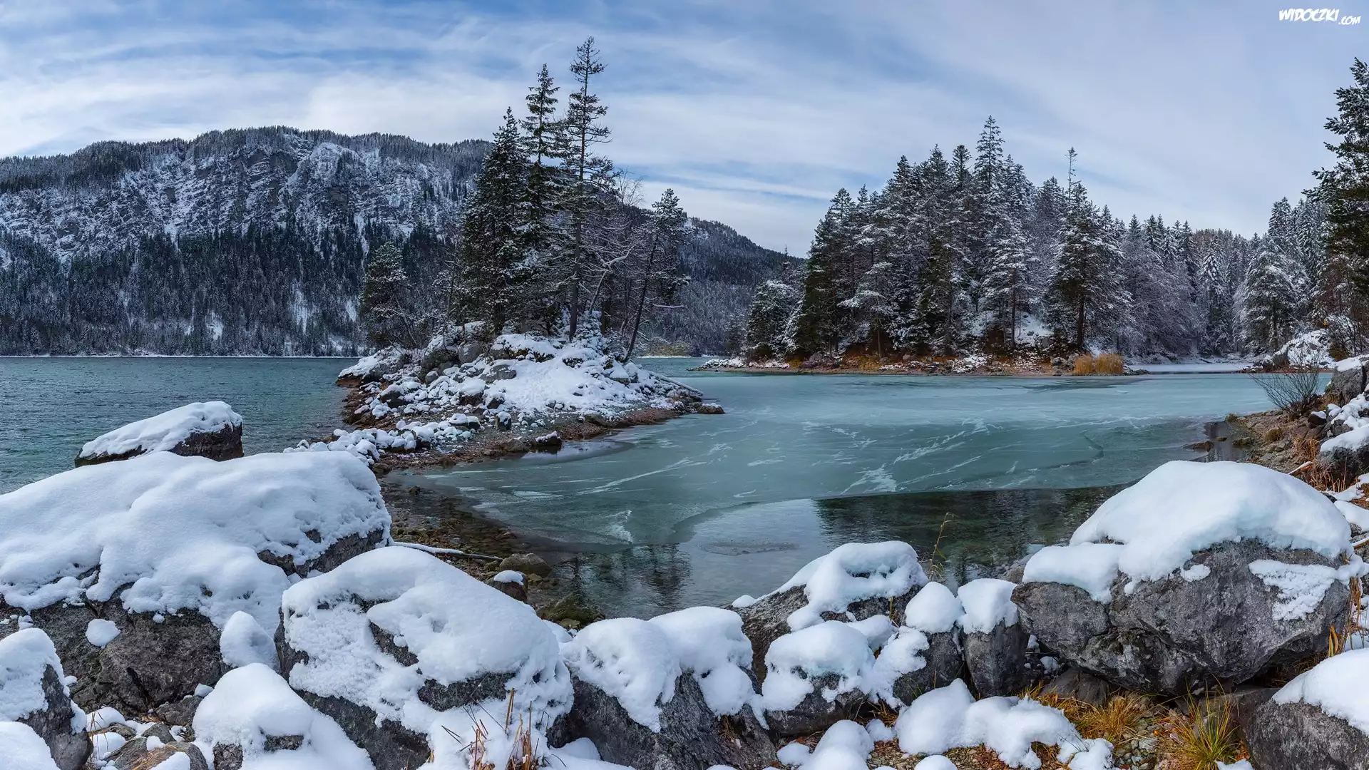 Zdjęcia, Góry, Jezioro Eibsee, Kamienie, Śnieg, Drzewa, Bawaria, Niemcy