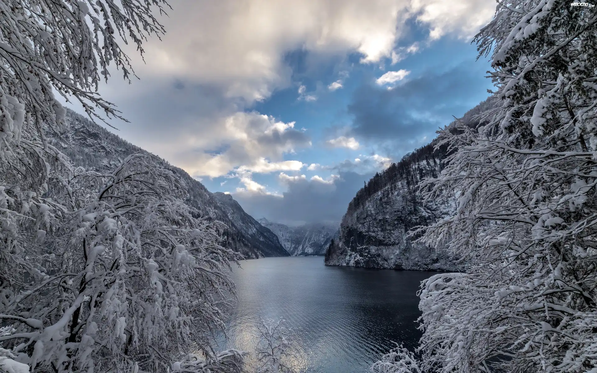 Zdjęcia, Niemcy, Bawaria, Park Narodowy Berchtesgaden, Zima, Jezioro Königssee, Góry Alpy