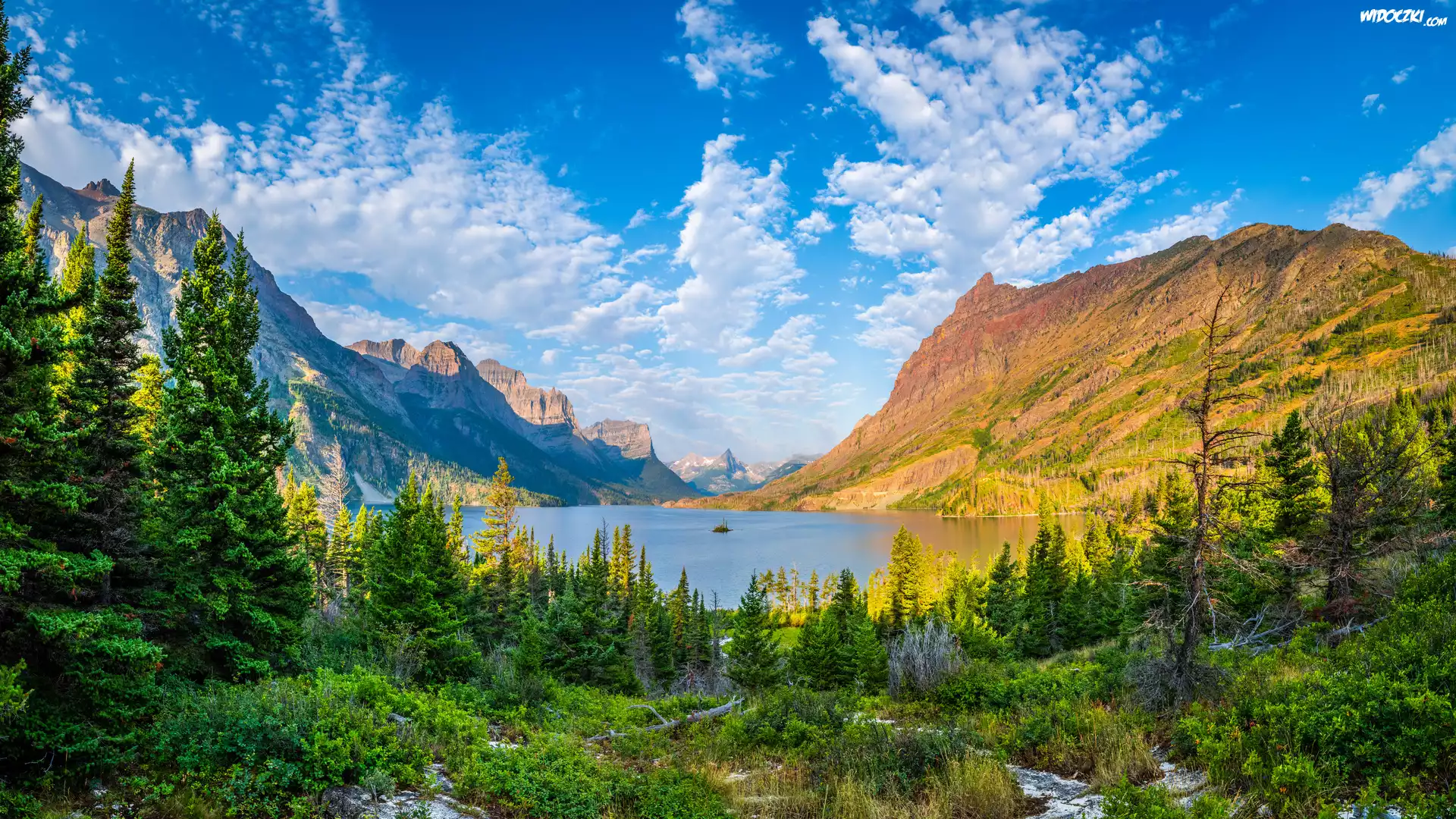 Zdjęcia, Park Narodowy Glacier, Jezioro, Saint Mary Lake, Góry, Drzewa, Obłoki, Montana, Stany Zjednoczone