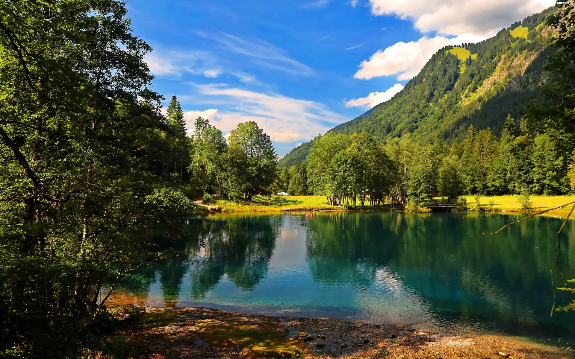 Jezioro, Góry, Niebo, Obłoki, Lato