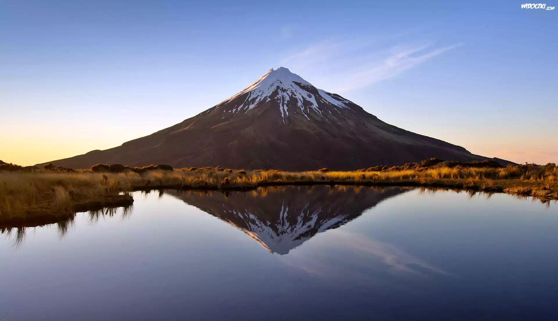 Zdjęcia, Jezioro, Łąka, Góra, Taranaki, Odbicie, Jesień