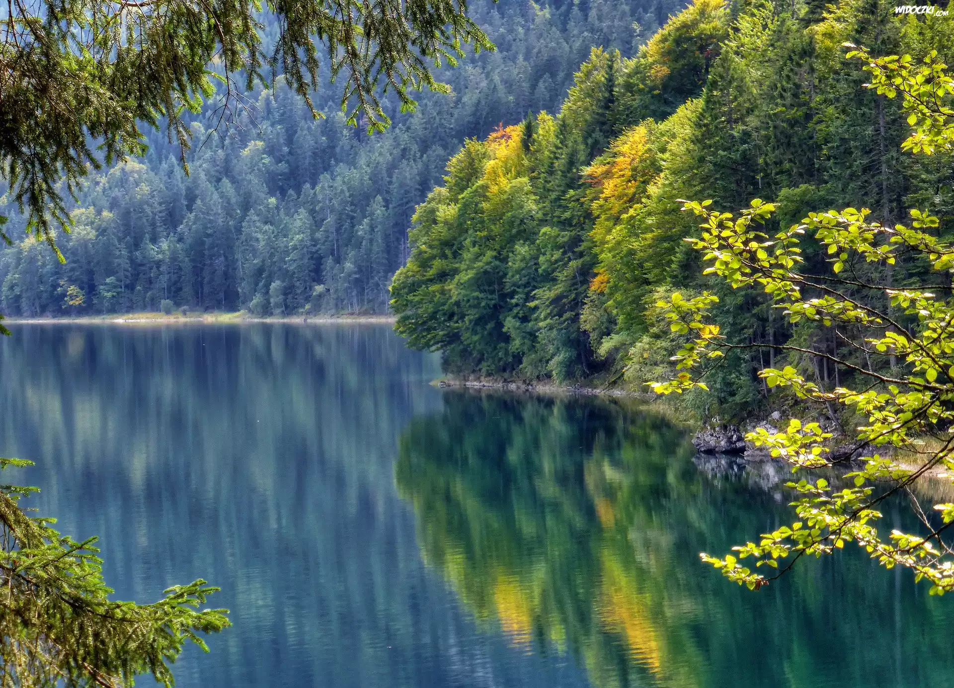 Zdjęcia, Jezioro, Las, Odbicie, Drzewa