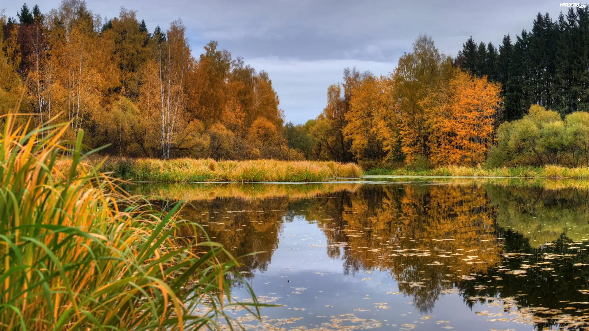 Jezioro, Drzewa, Las, Jesień, Odbicie, Trawa
