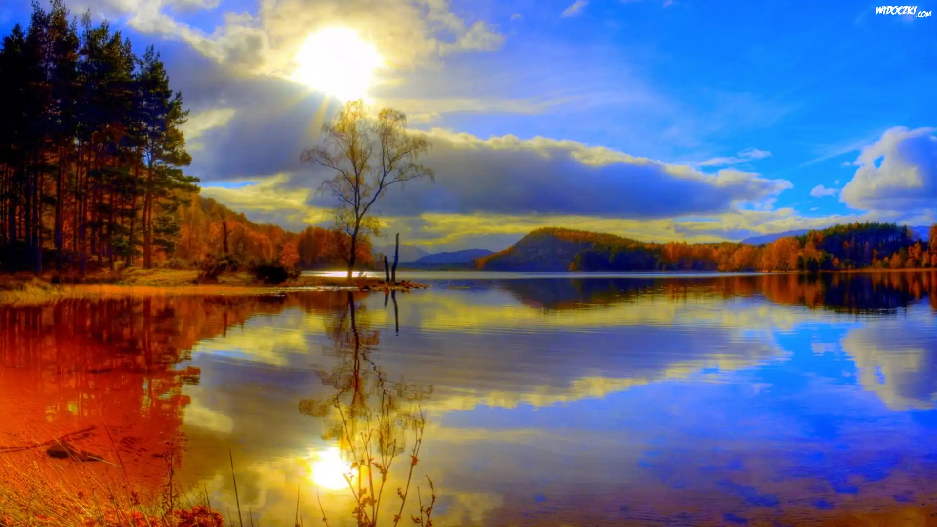 Jezioro, Las, Odbicie, Jesień