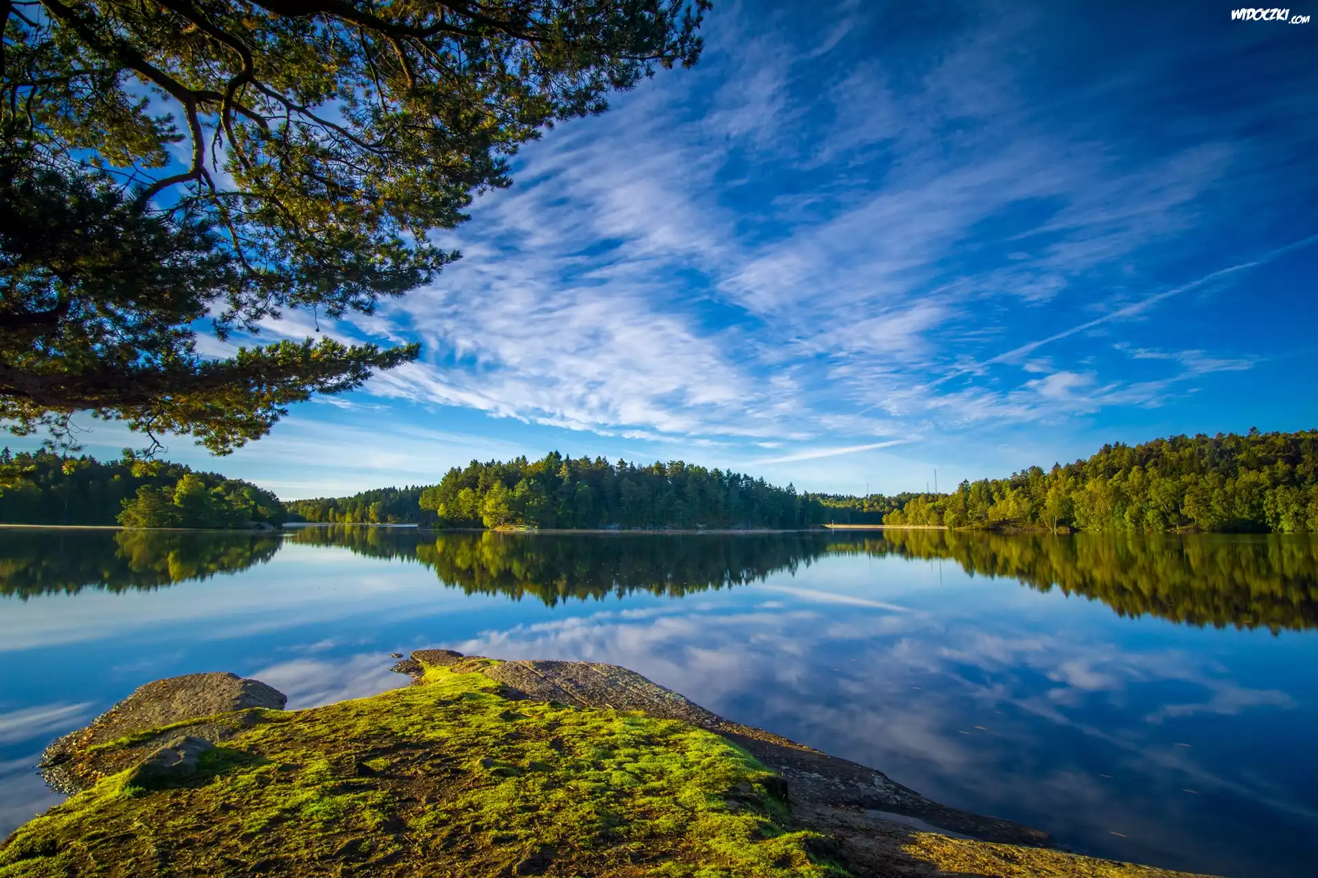 Zdjęcia, Jezioro, Omszała, Skała, Drzewa, Odbicie, Niebo
