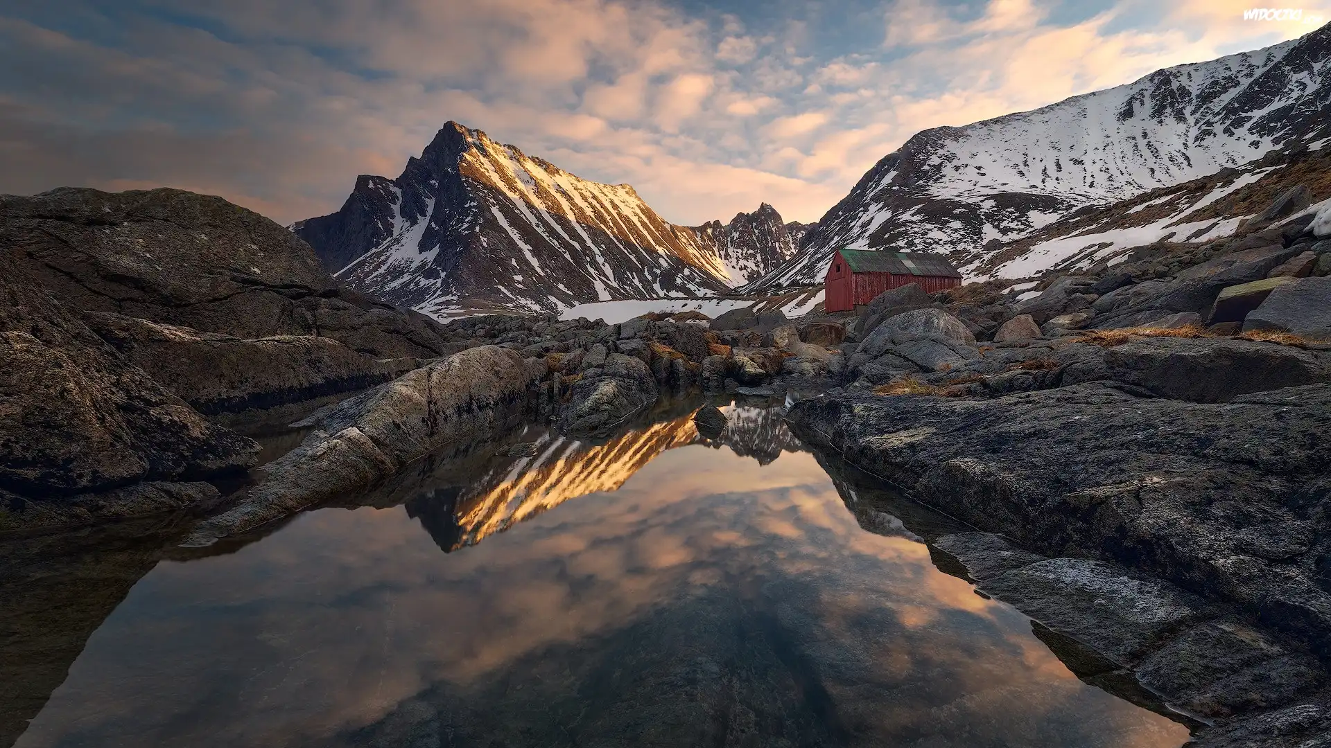 Zdjęcia, Ośnieżone, Góry, Skały, Jezioro, Dom, Odbicie