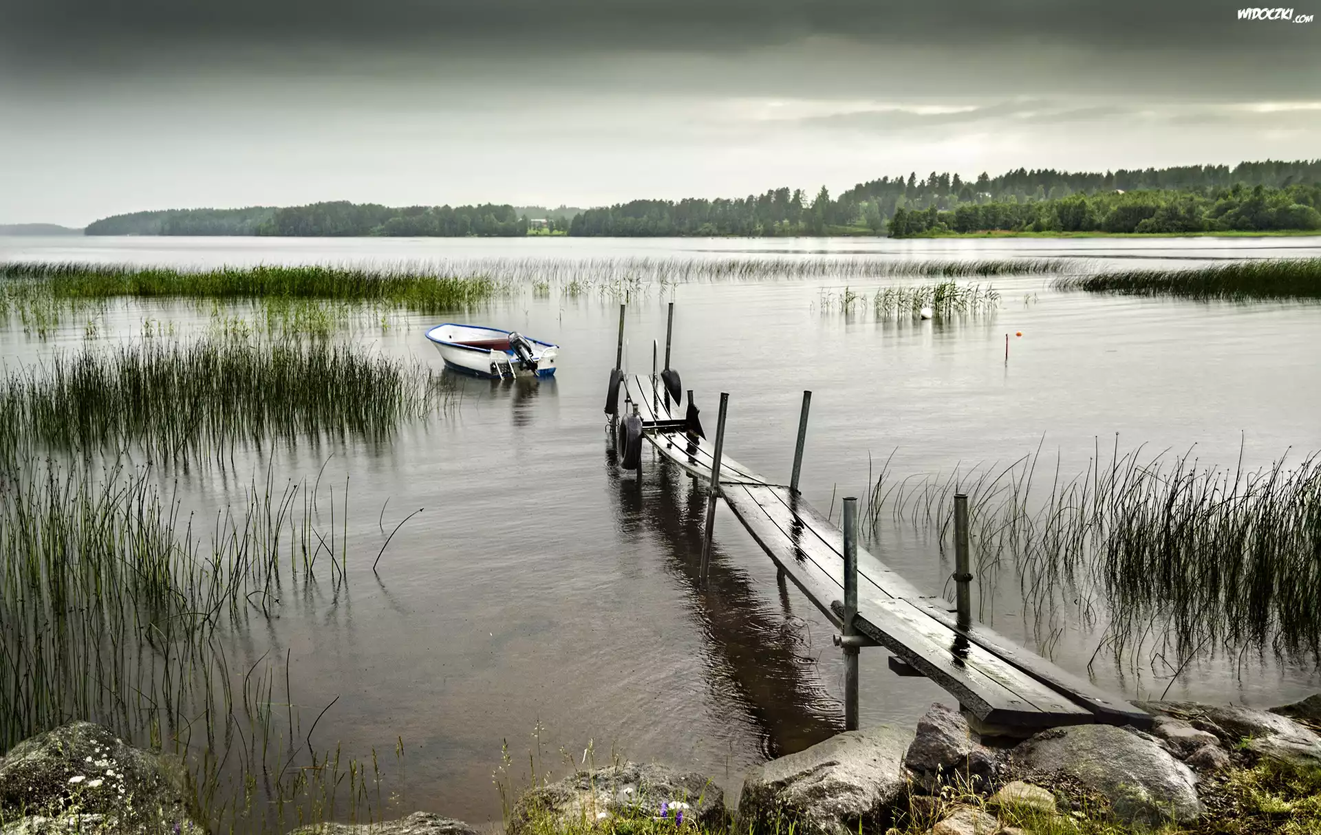 Zdjęcia, Jezioro, Pomost, Łódka, Trzciny