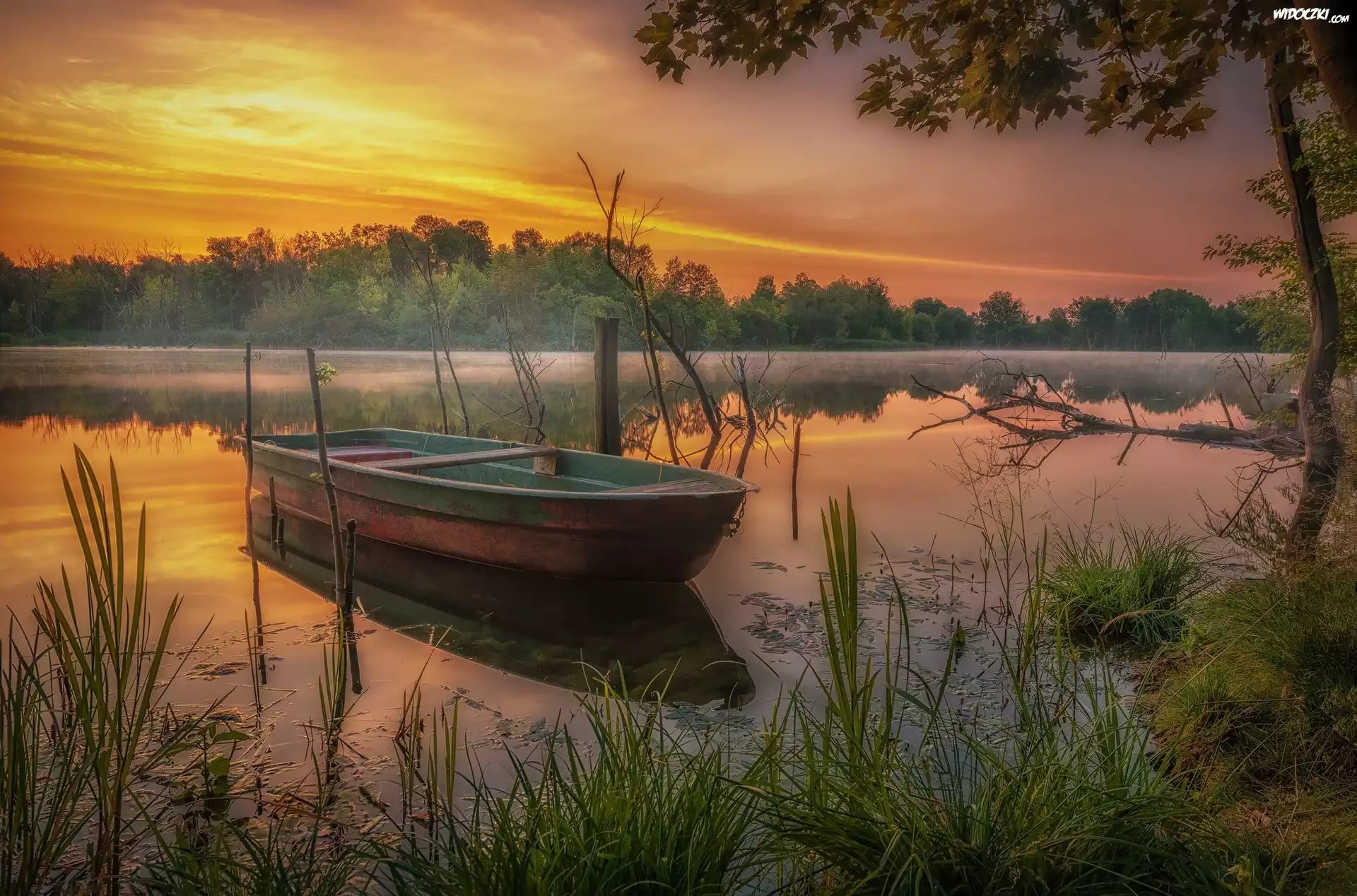 Zdjęcia, Jezioro, Wschód słońca, Łódka, Drzewa