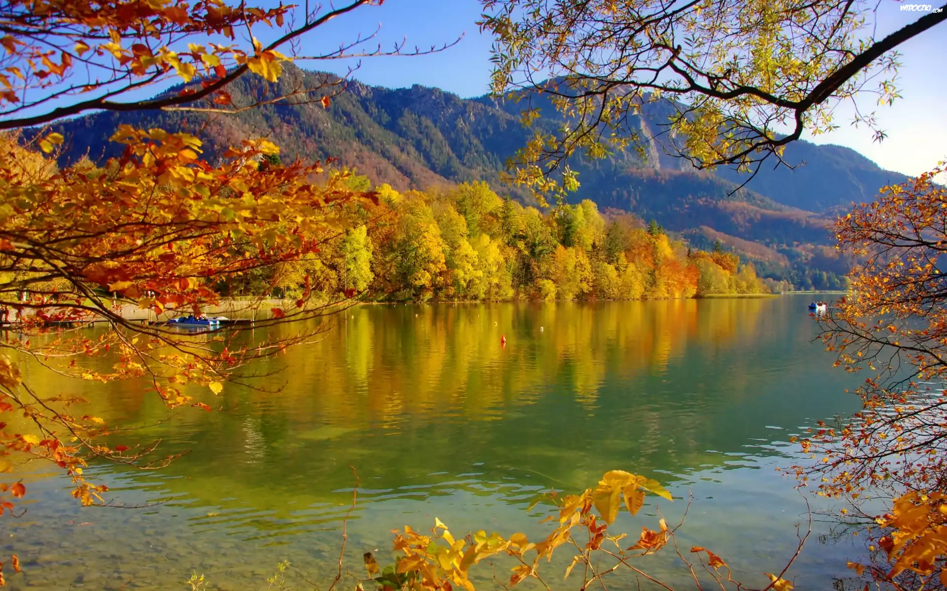 Jezioro, Góry, Lasy, Drzewa, Łódki, Jesień