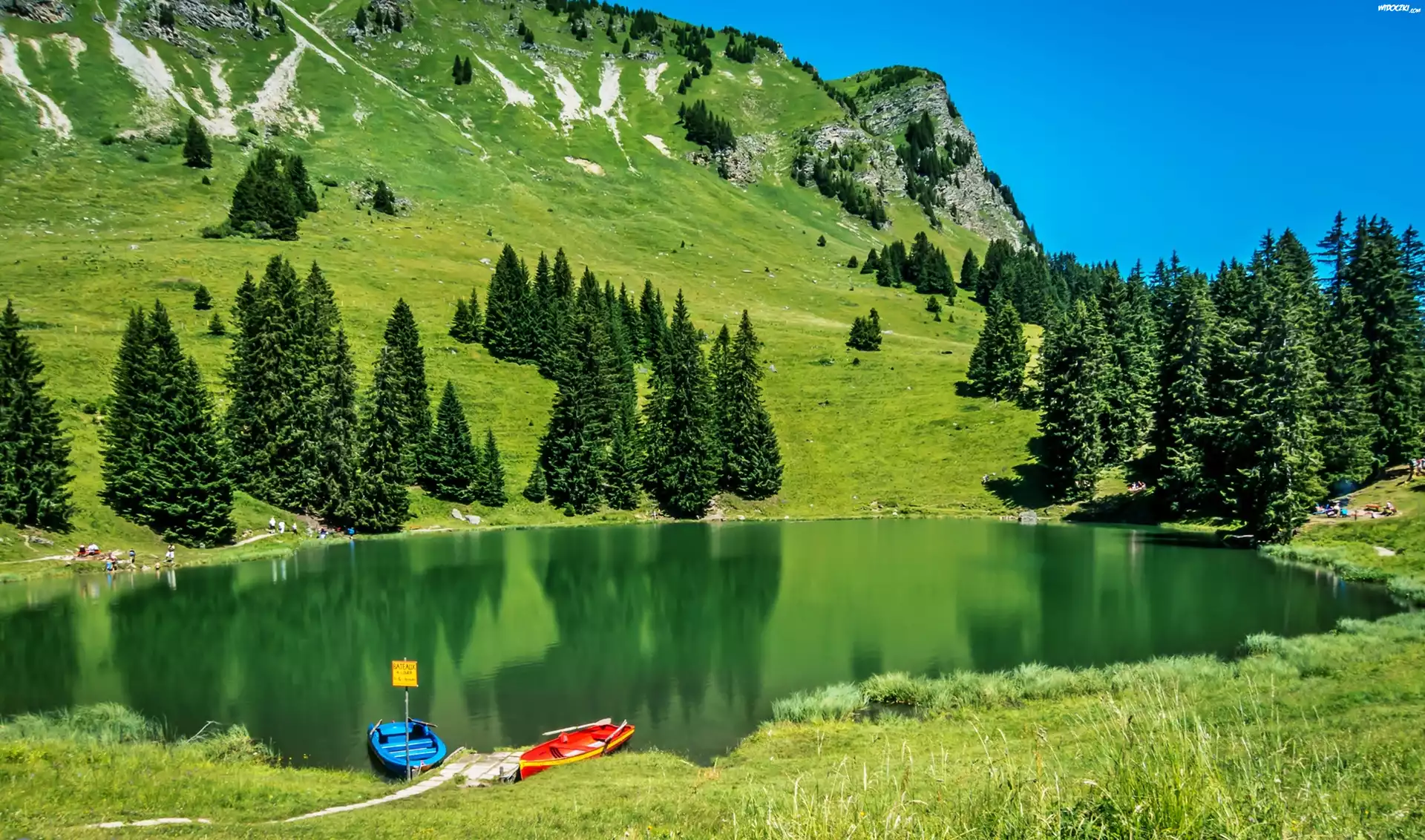 Zdjęcia, Jezioro, Góry, Łodzie, Drzewa