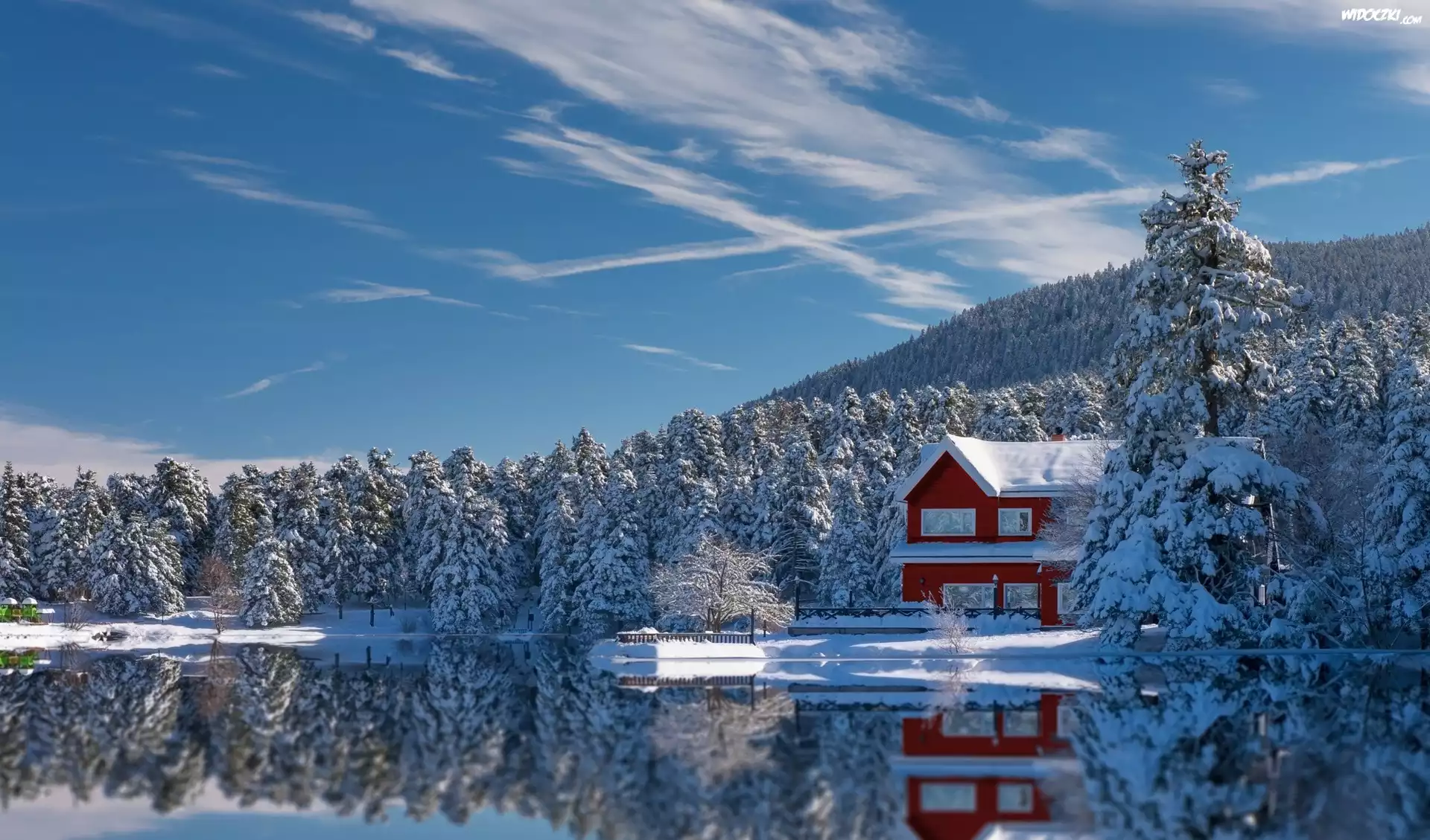 Zdjęcia, Jezioro, Zima, Domek, Ośnieżone, Drzewa