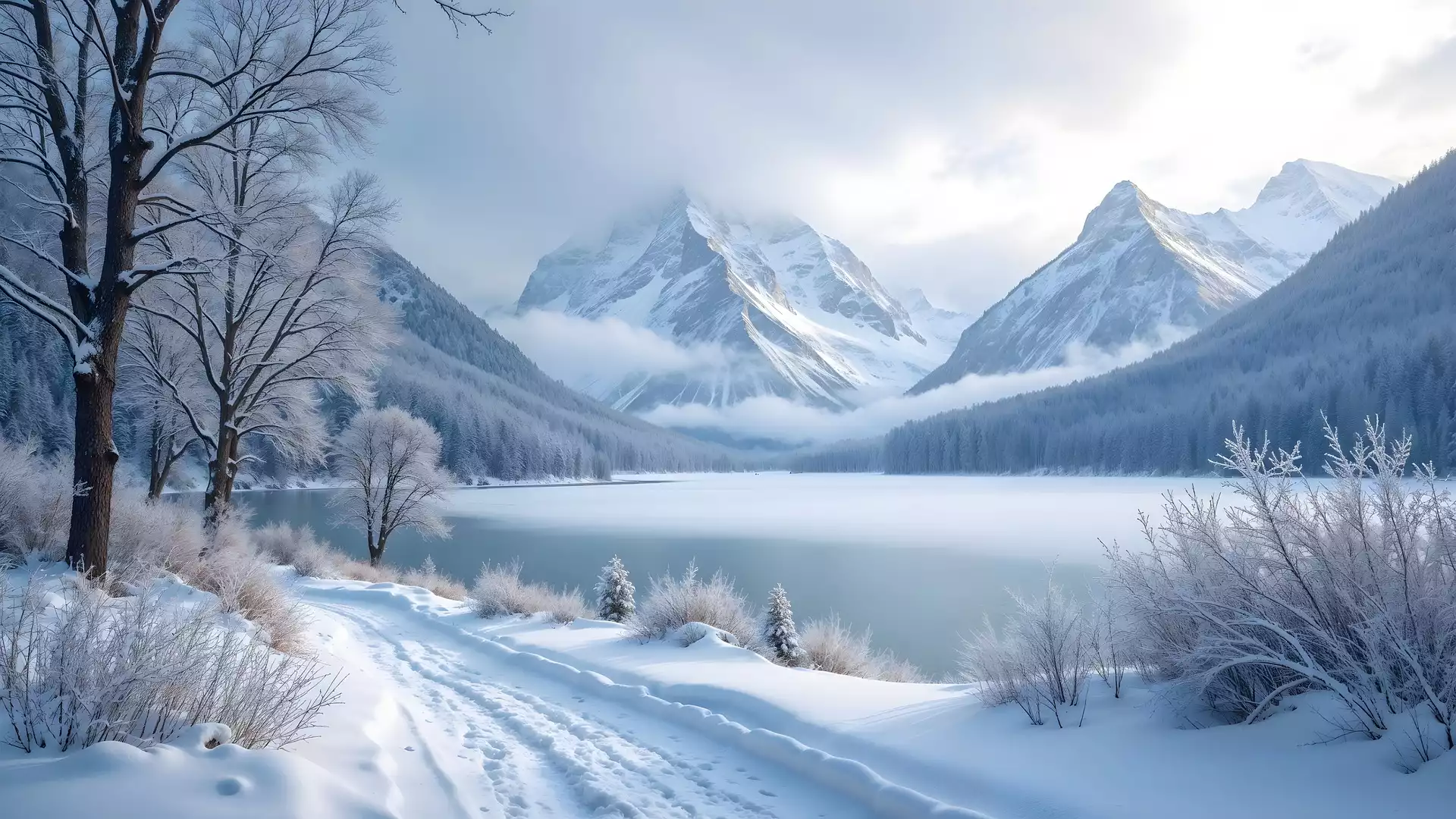 Zima, Góry, Ośnieżone, Jezioro, Drzewa, Droga, AI