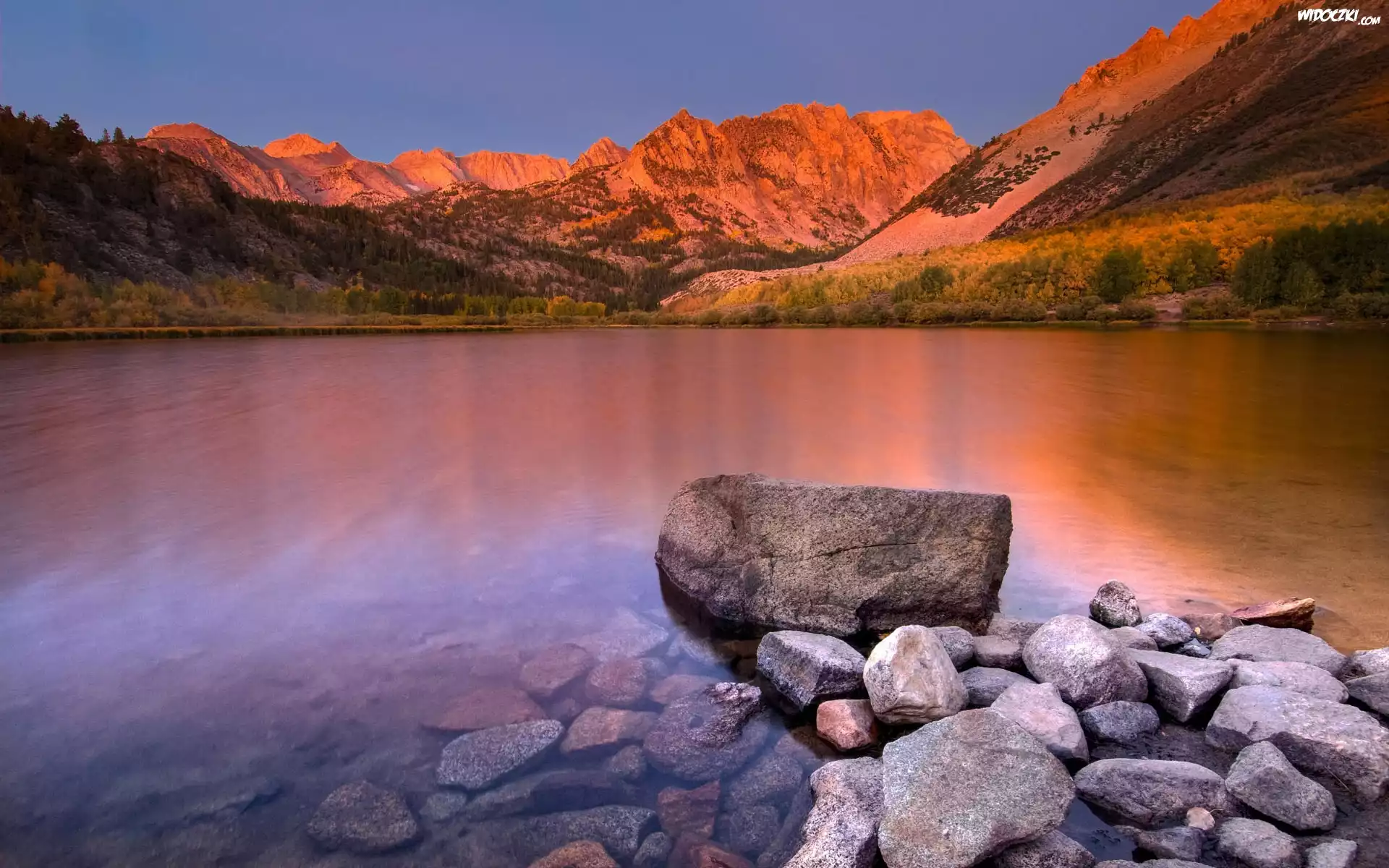 Zdjęcia, Jezioro, Kamienie, Oświetlone, Stoki