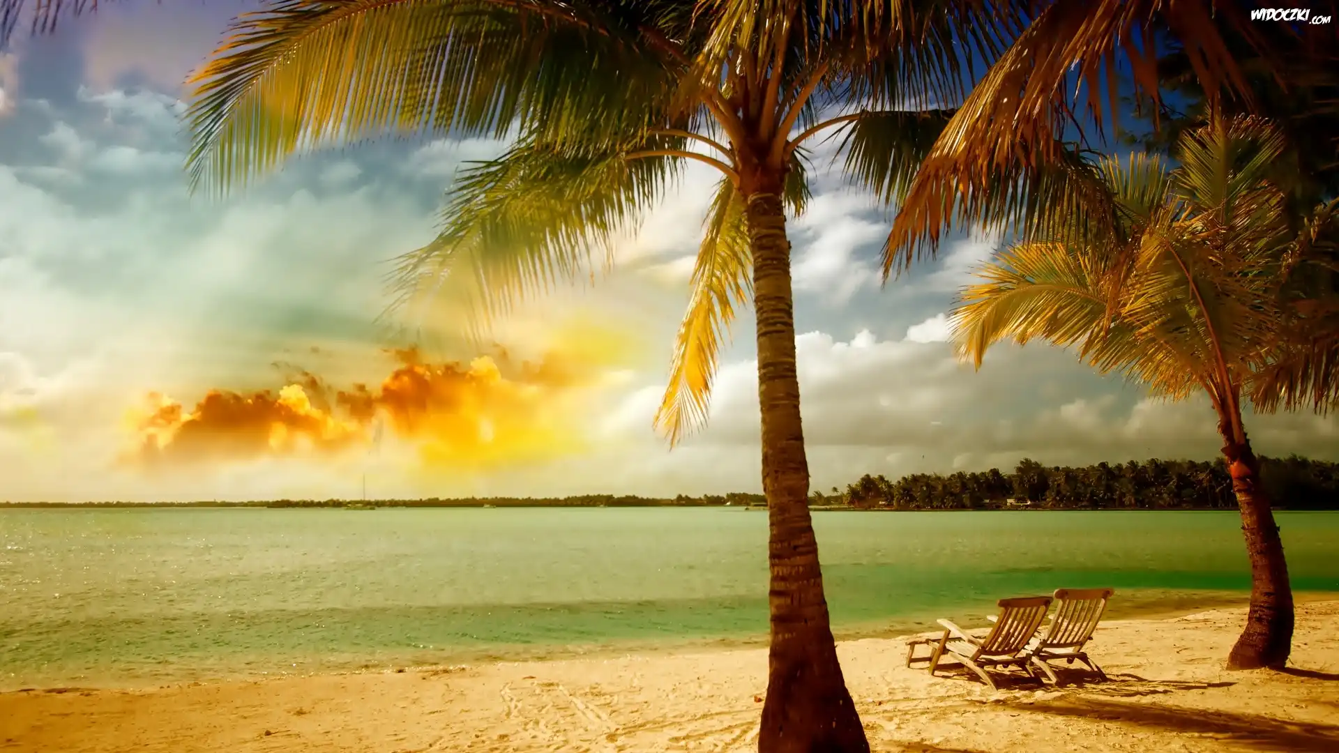 Zdjęcia, Jezioro, Plaża, Palmy, Leżaki, Wakacje