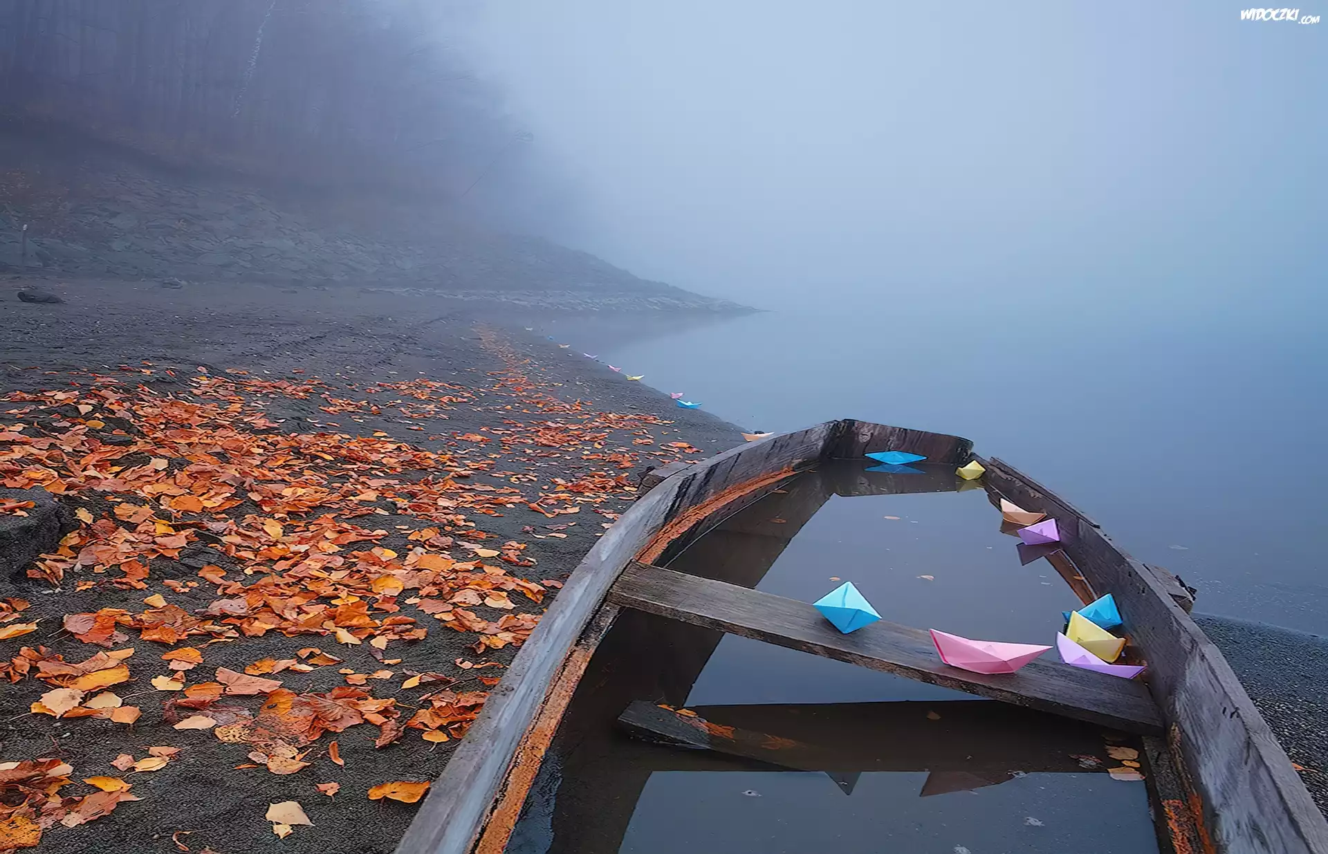 Zdjęcia, Łódka, Papierowe, Łódeczki, Jezioro, Liście