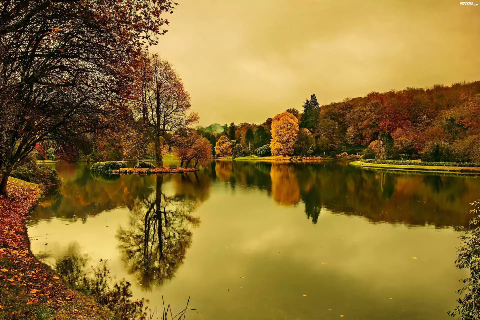 Jezioro, Lasy, Park, Jesień