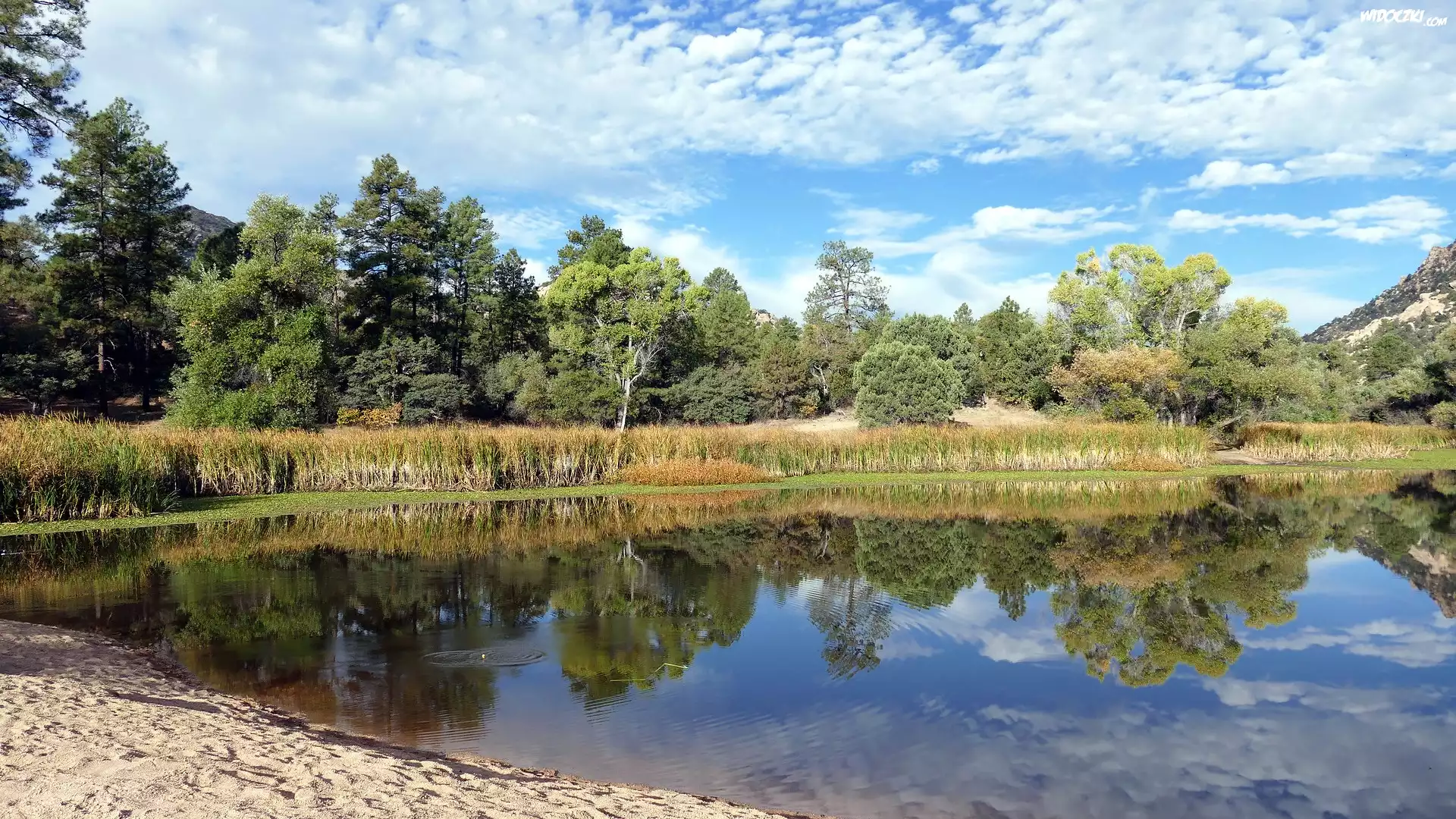Zdjęcia, Jezioro, Drzewa, Szuwary, Piasek, Rośliny