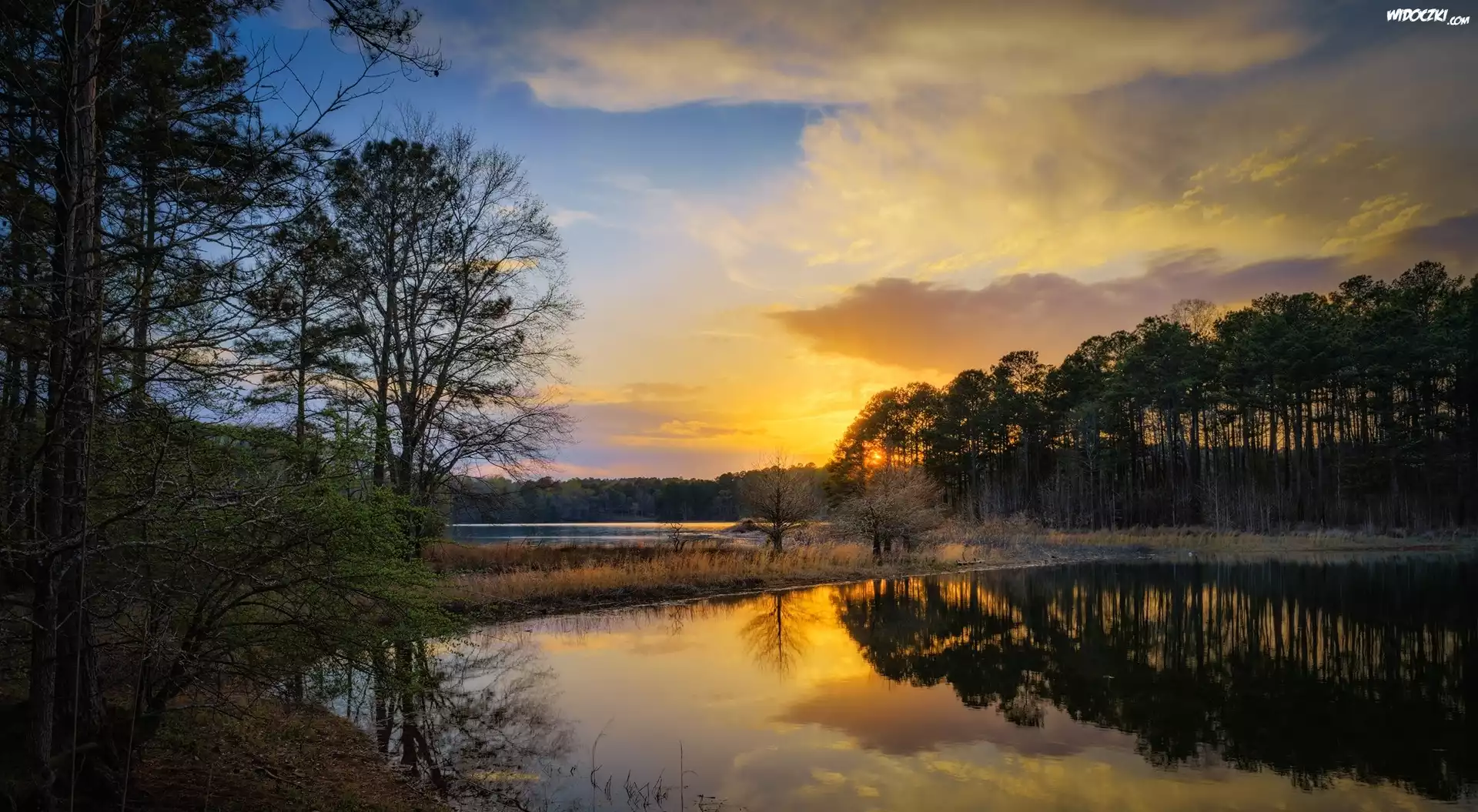 Stany Zjednoczone, Jezioro West Point Lake, Zachód słońca, Odbicie Drzewa, Las