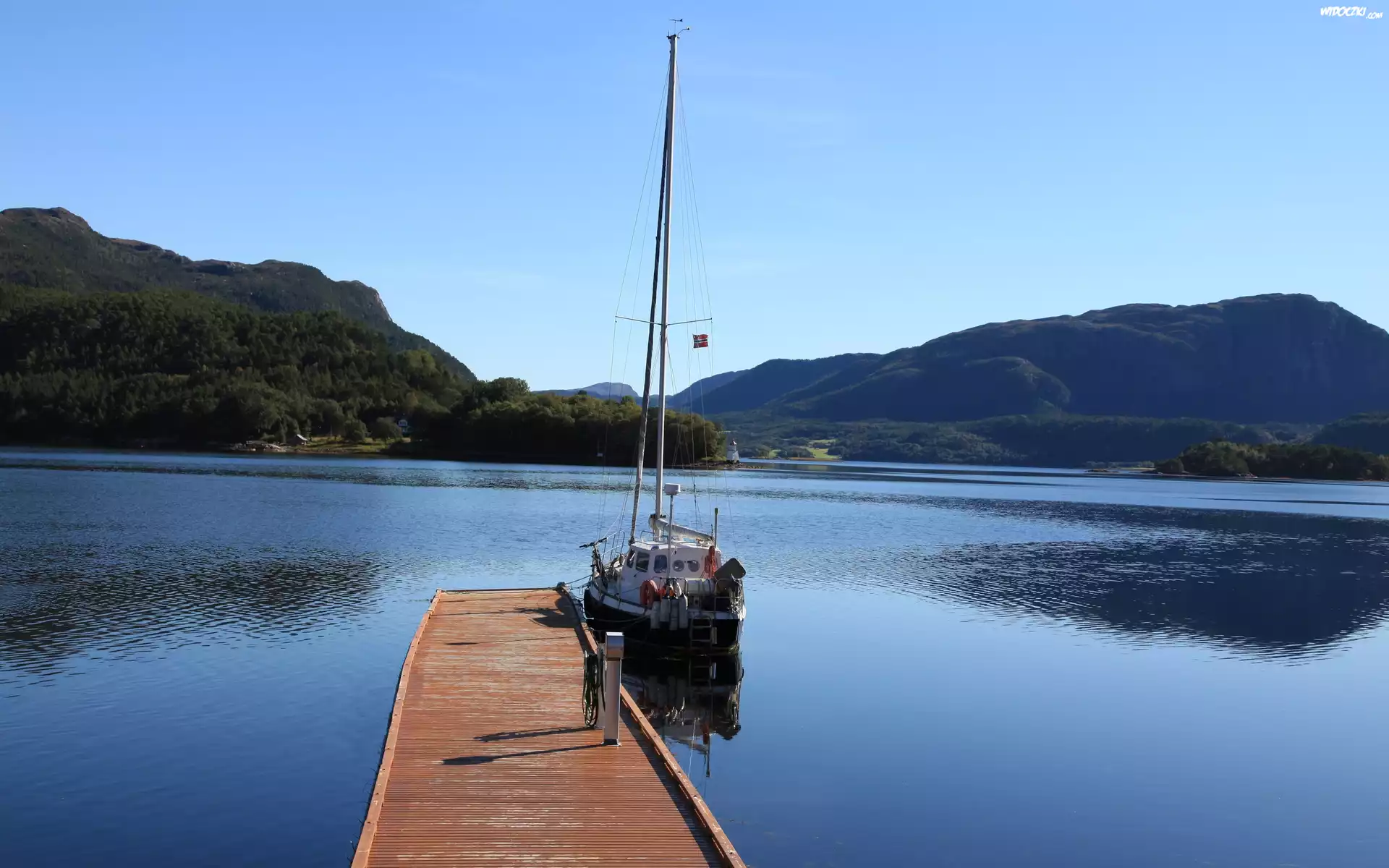 Zdjęcia, Jezioro, Żaglówka, Pomost, Góry