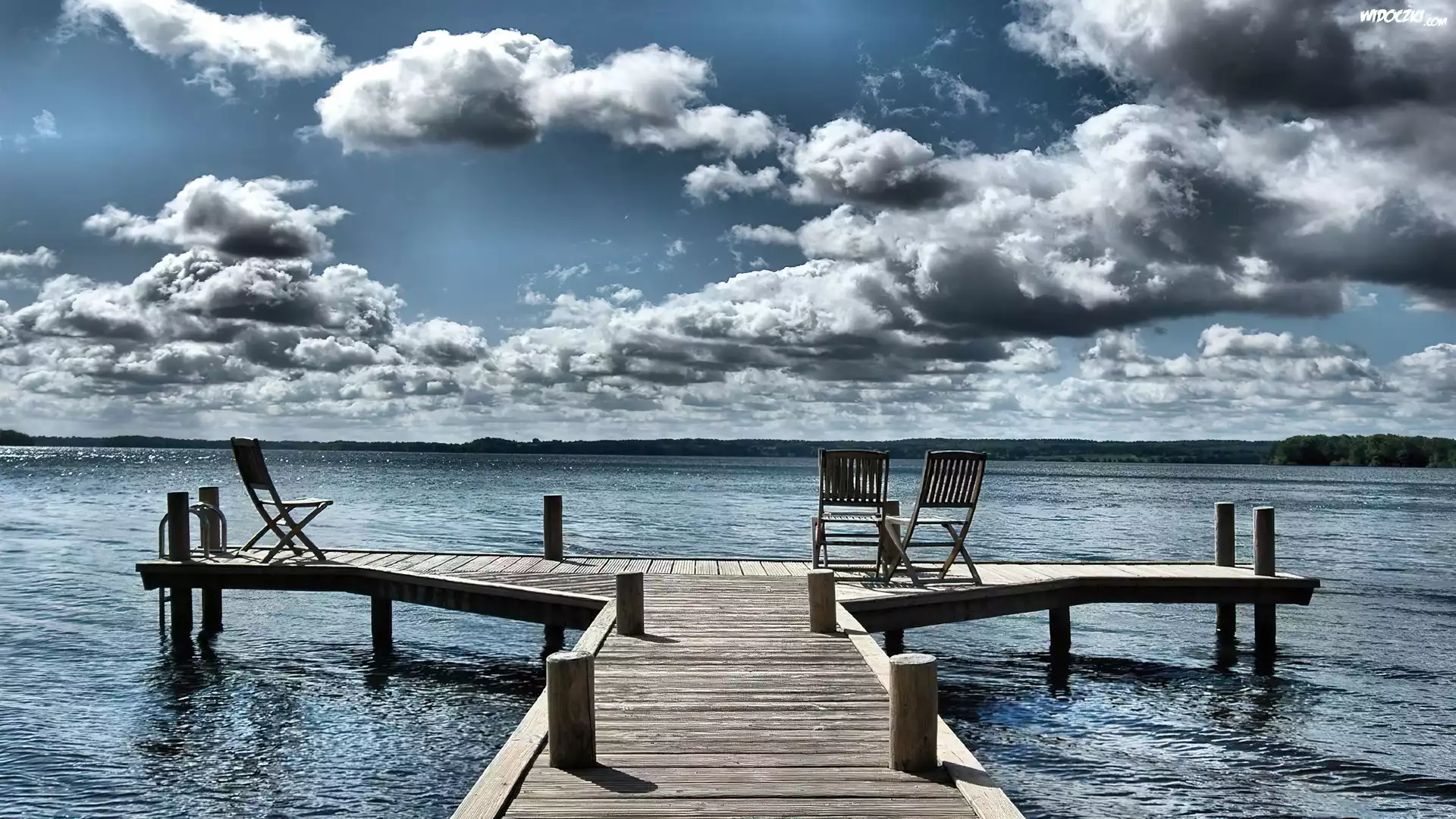 Zdjęcia, Jezioro, Chmury, Pomost, Leżaki