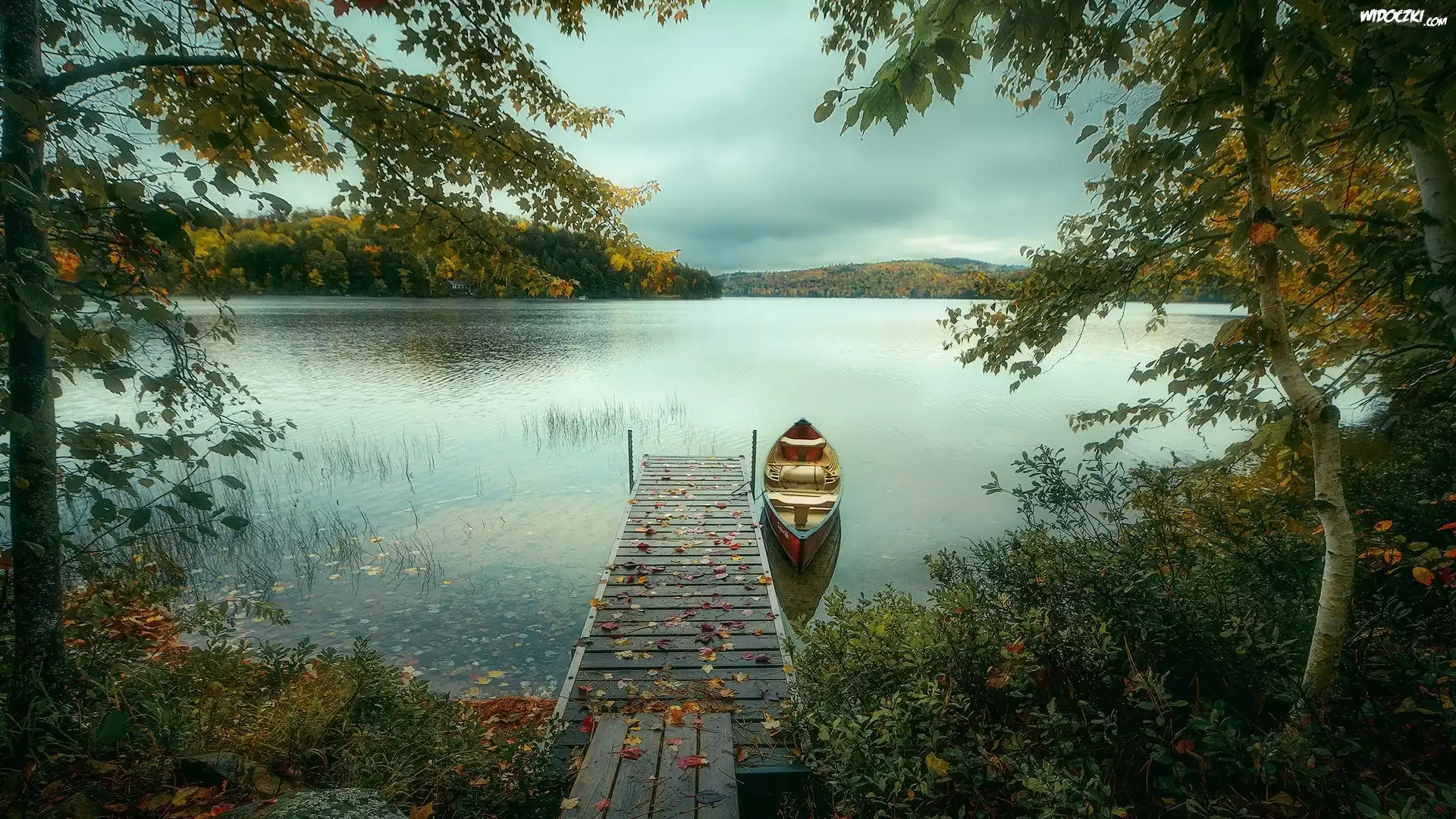 Zdjęcia, Jesień, Jezioro, Pomost, Łódka, Drzewa