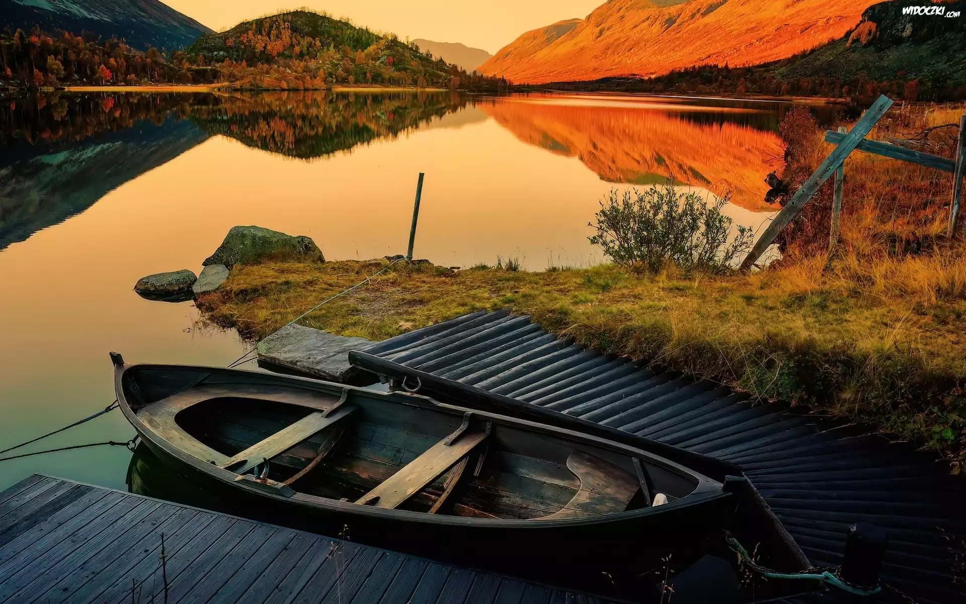 Góry, Jezioro, Pomost, Łódka, Odbicie
