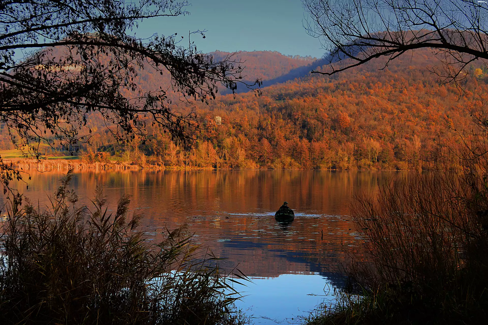 Zdjęcia, Jezioro, Jesień, Ponton, Krzewy