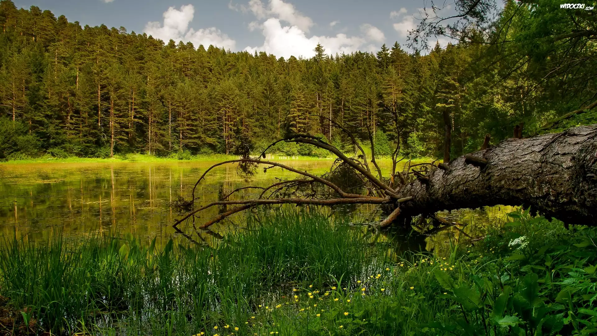 Jezioro, Las, Rośliny, Powalone, Drzewo