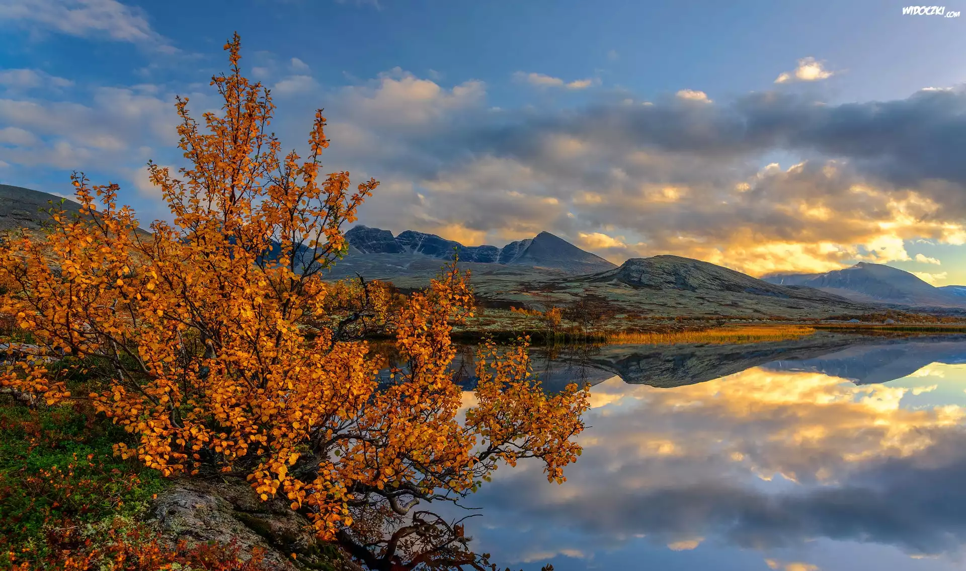 Zdjęcia, Góry, Jezioro, Pożółkłe, Drzewa, Jesień