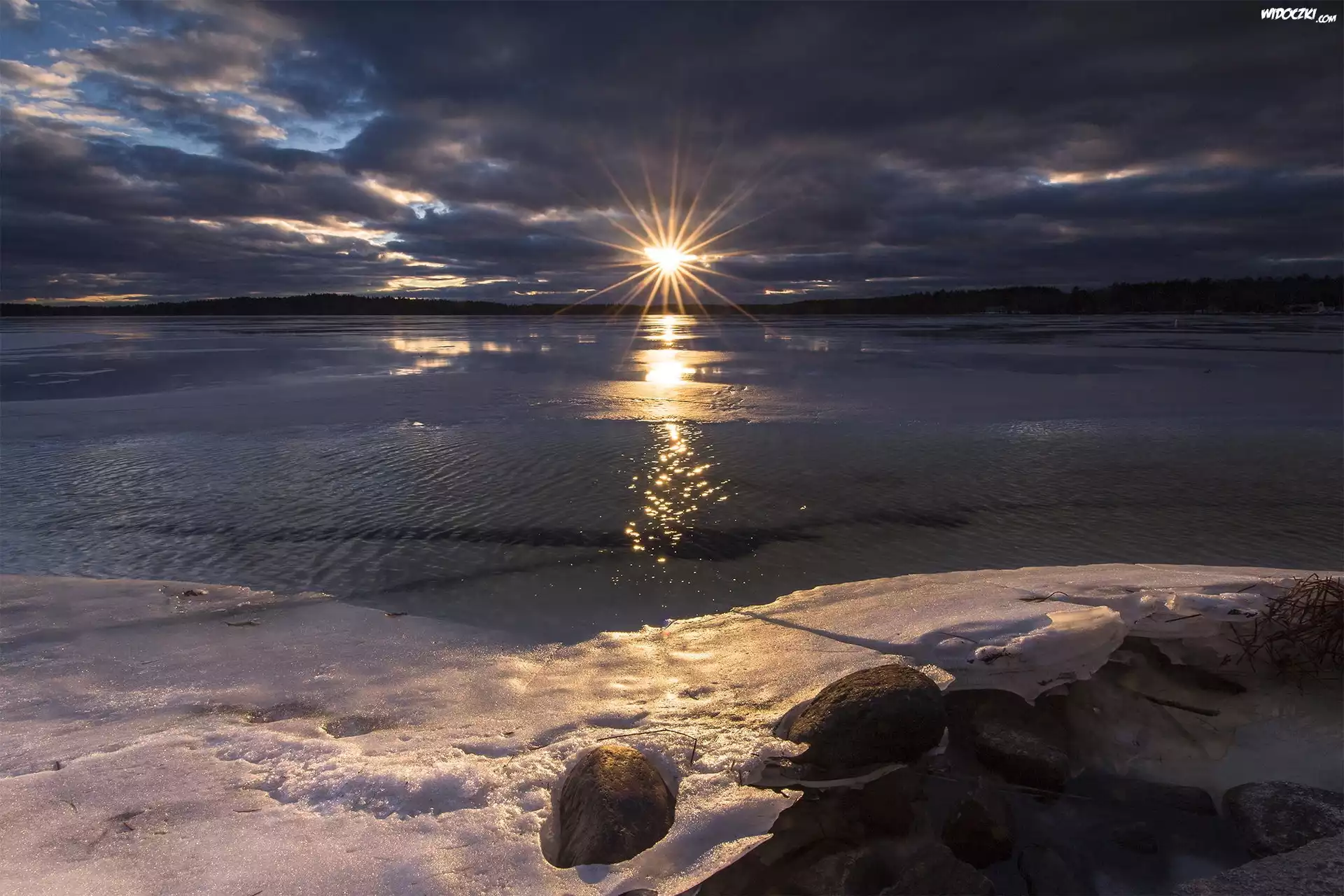 Zdjęcia, Jezioro, Zima, Brzeg, Kamienie, Promienie, Słońca