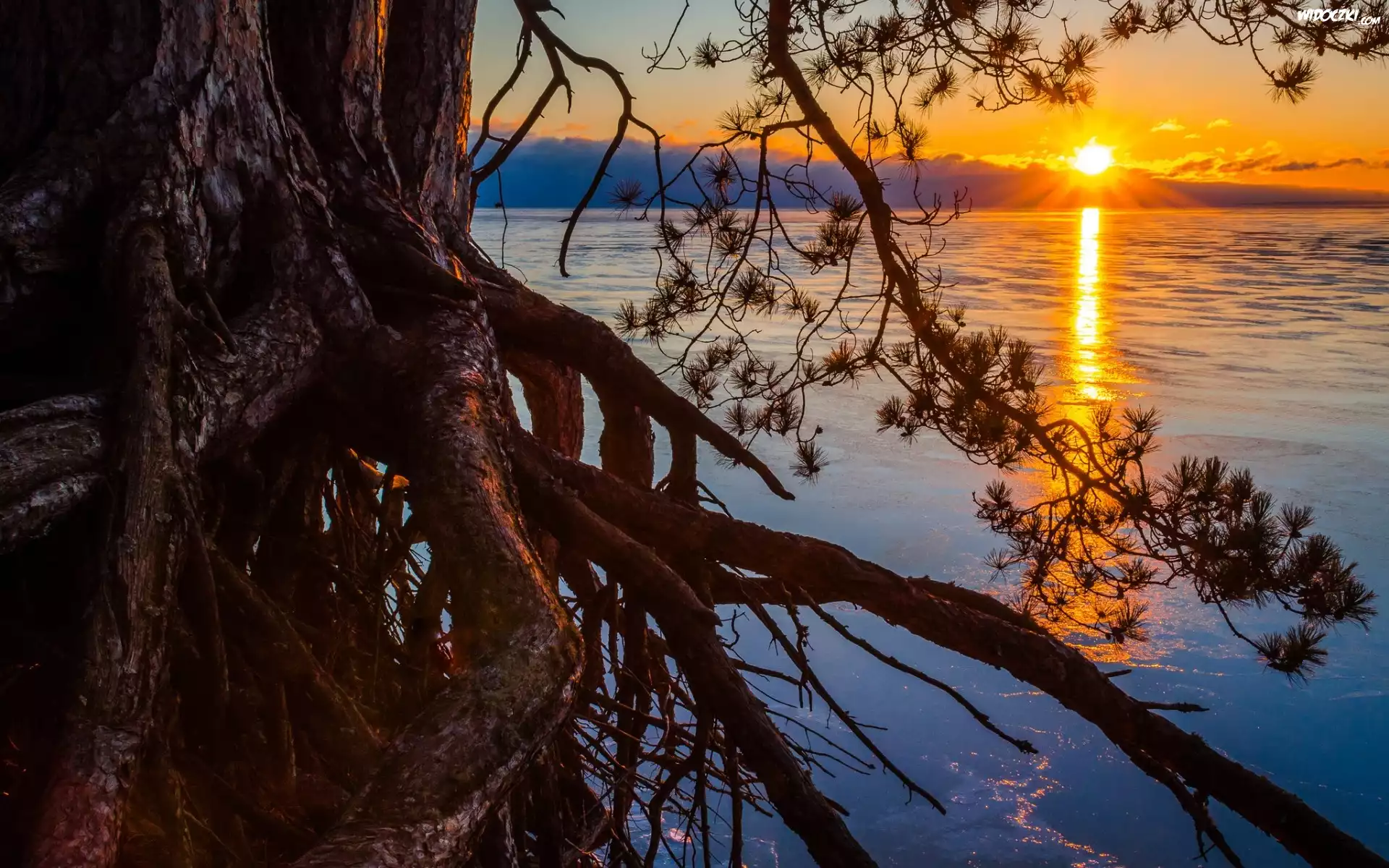 Jezioro, Drzewa, Chmury, Promienie, Słońca