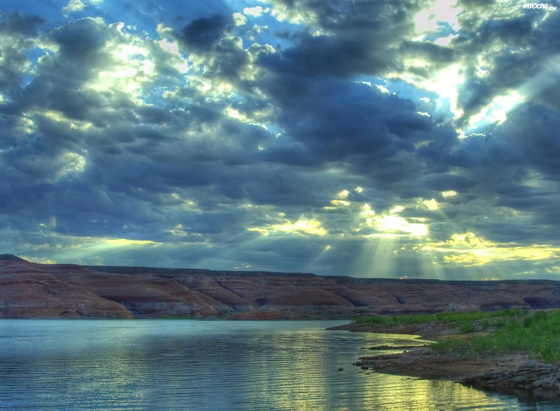 Zdjęcia, Jezioro, Góry, Chmury, Promienie Słońca