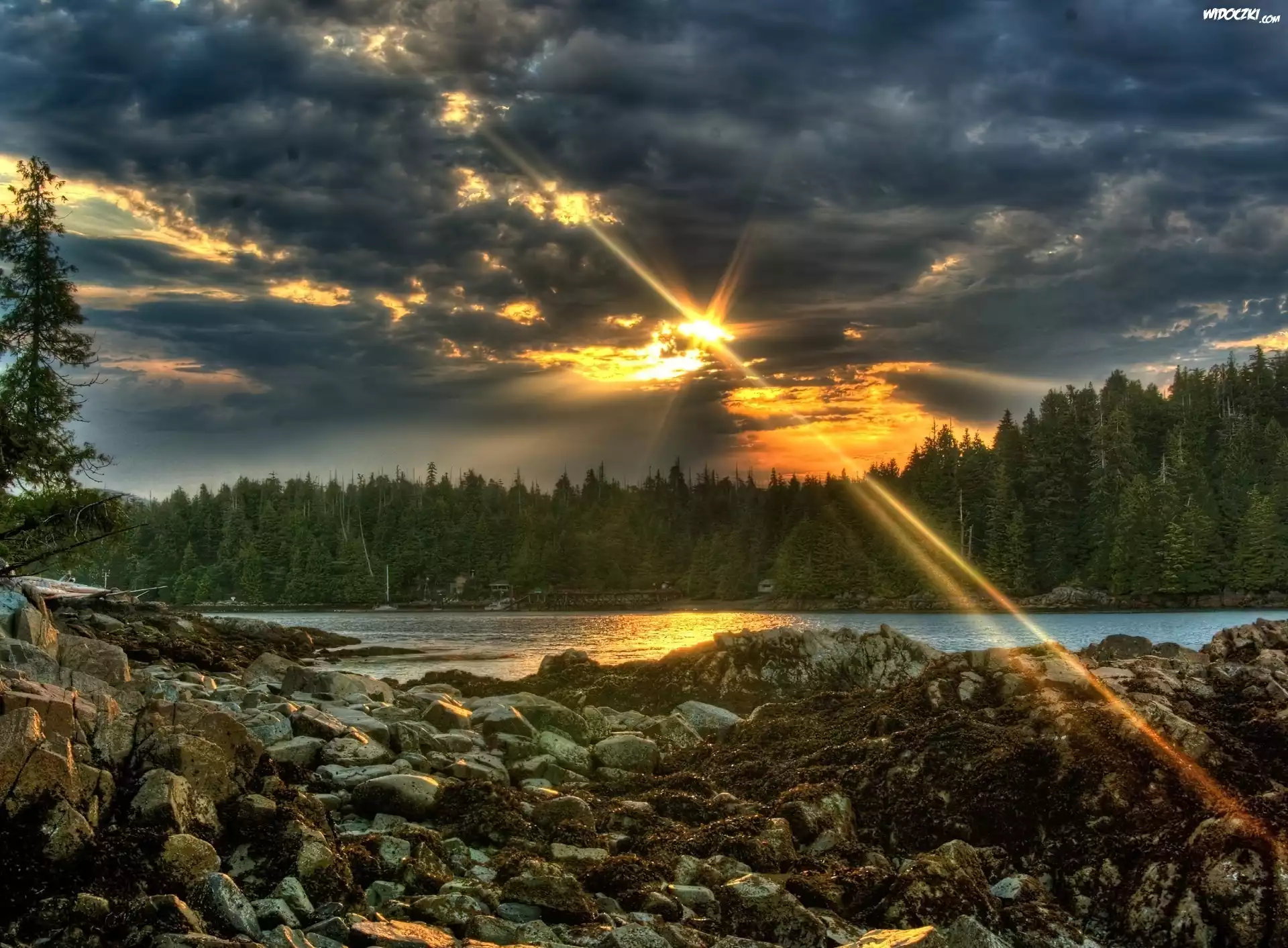 Zdjęcia, Jezioro, Lasy, Ciemne, Chmury, Promienie Słońca