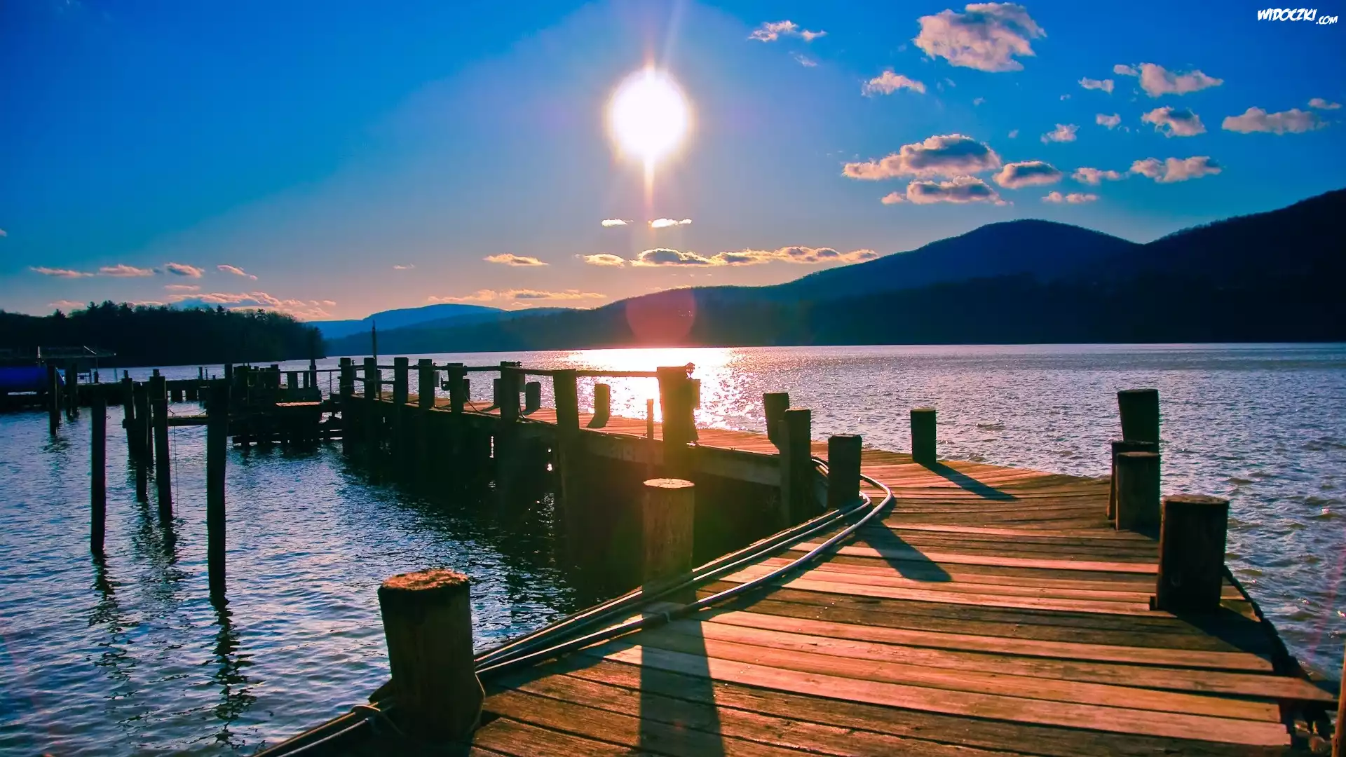 Zdjęcia, Jezioro, Pomost, Góry, Promienie, Słońca