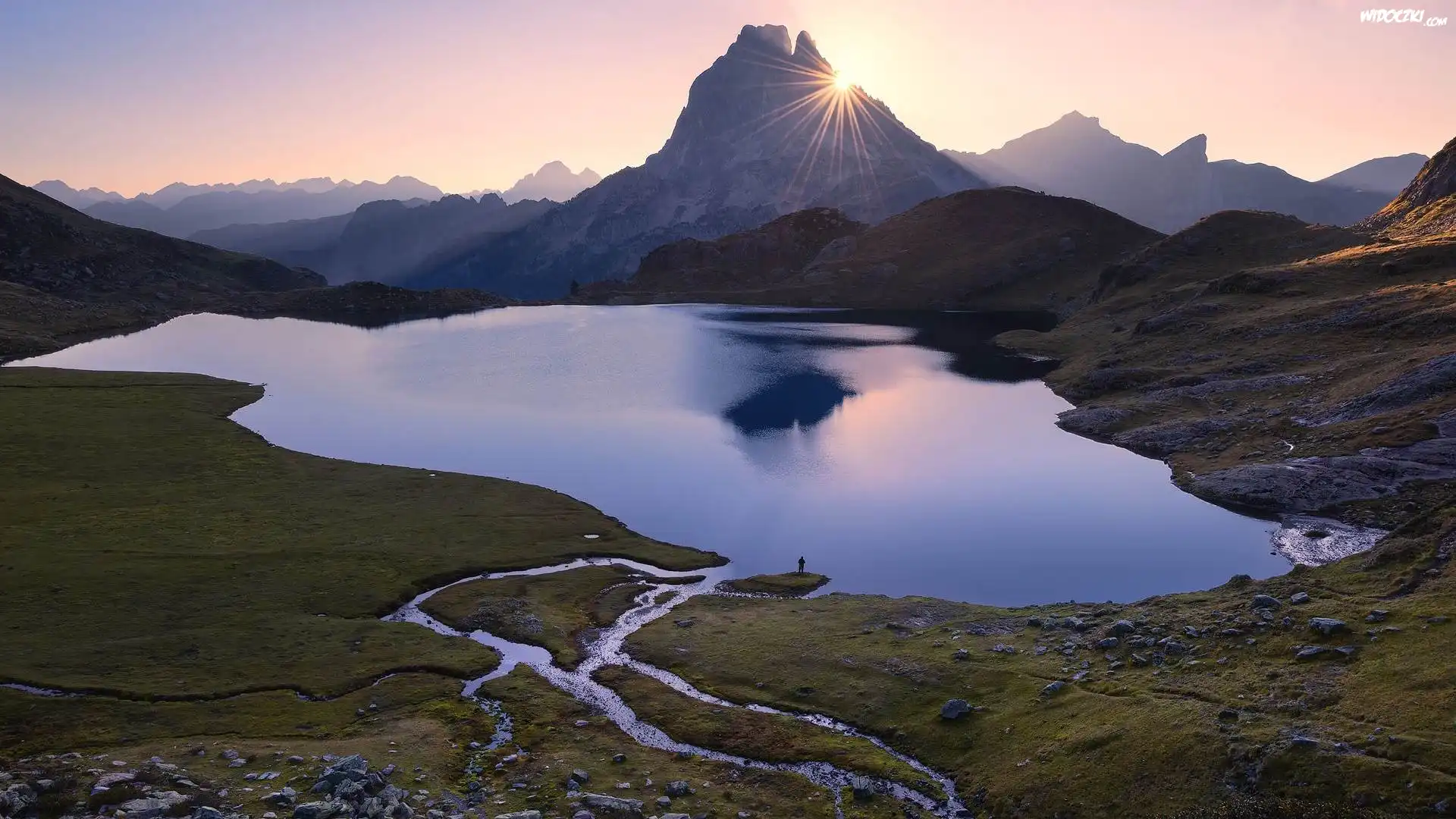 Zdjęcia, Jezioro, Góry, Pireneje, Promienie słońca